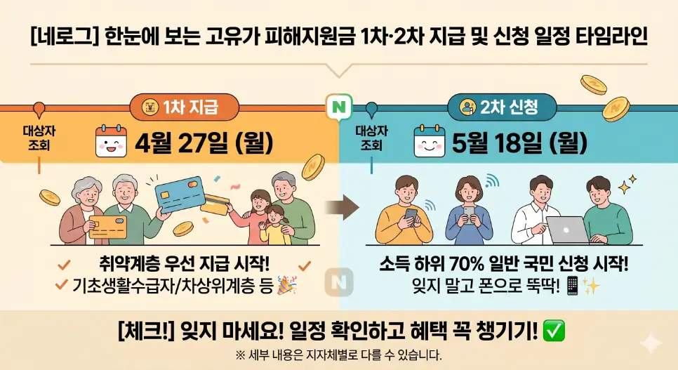 신청·지급 기간은 두 차례로 나뉩니다. 기초·차상위·한부모 가구는 1차 2026년 4월 27일(월)~5월 8일(금), 2차 2026년 5월 18일(월)~7월 3일(금)에 신청할 수 있습니다. 단, 1차 기간에 신청·지급 받은 경우 2차에는 신청이 불가합니다.