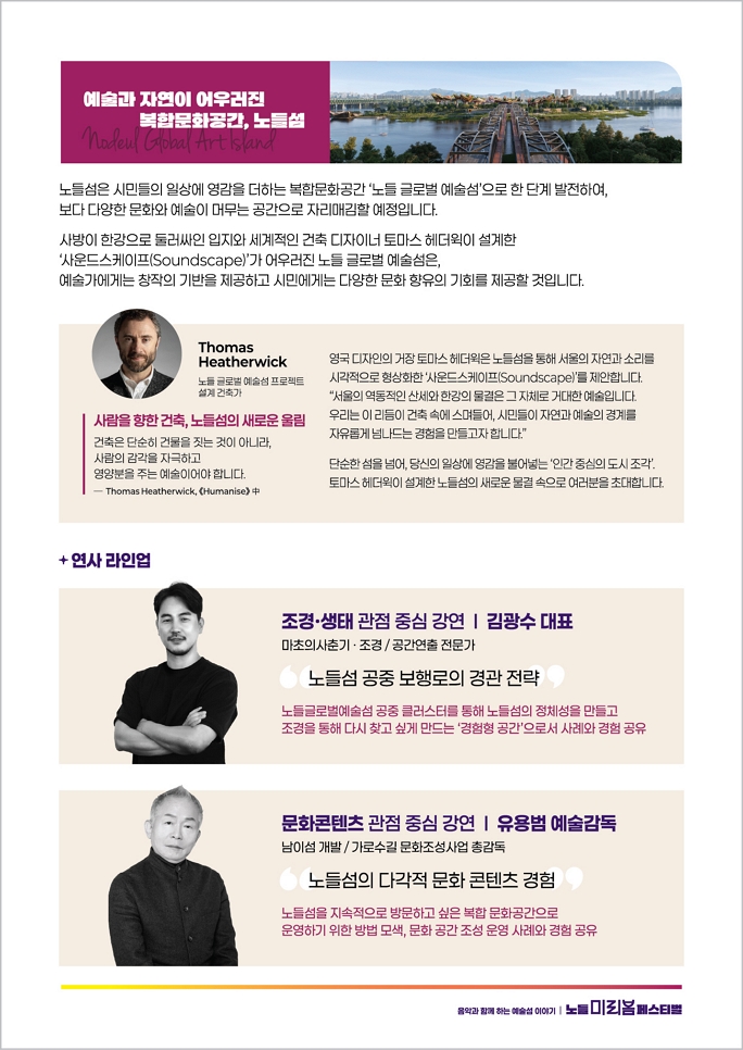 조경·공간연출 전문가인 김광수 대표는 **'노들섬 공중 보행로의 경관 전략'**을 주제로 강연한다. 노들 글로벌 예술섬에 조성될 공중 클러스터를 통해 노들섬의 정체성을 어떻게 만들어갈지, 다시 찾고 싶어지는 '경험형 공간'의 사례를 공유한다. 공중에서 내려다보는 한강이 어떤 풍경이 될지 — 강연만으로도 충분히 그려질 것 같다.