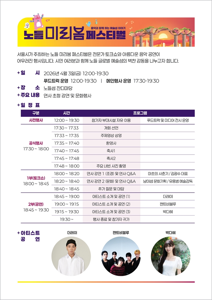 오늘 4월 3일 노들섬 잔디마당에서 '노들 미리봄 페스티벌'이 열린다. 토마스 헤더윅의 노들 글로벌 예술섬 강연부터 더레이·캔트비블루·박다혜의 한강 일몰 라이브까지, 지금 바로 확인해봐요.