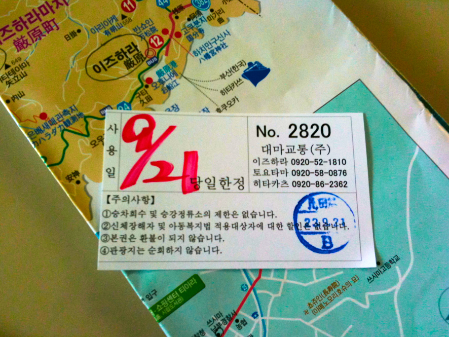 히타카츠버스 터미널이다. 이미 내 기억에는 없는 작은 대합실의 매표소 건물이다. 이즈하라 행 표를 구매했는데, 저렇게 종일권이다. 몇번 타도 된다고 한다. 한국어로된 표를 일본에서 구매하니 기분인 묘하다.