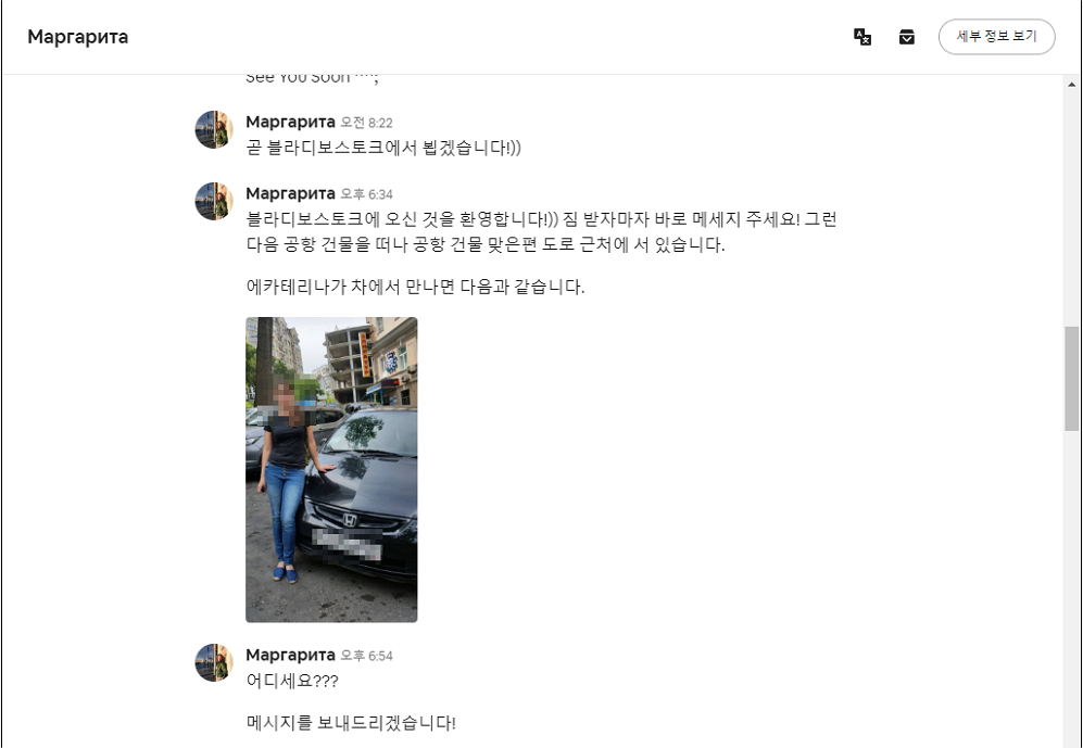 블라디보스토크 시내로 들어가는 방법을 찾아 봤는데, 몇 가지 있다. 공항버스와 택시, 개통한 지 얼마 되지 않은 기차 등 방법이다. 다른 여행기를 검색해 보면, 국제공항임에도 불구하고 버스와 기차는 시간표대로 운행하지 않는다고 한다. 블라디보스토크 시내로 들어가는 공항버스라 불리는 버스는 일반 버스보다 작고, 승합차보다는 큰 그런 차량이라고 한다. 그래서 처음 계획은 택시를 이용하려고 마음먹고 있었다. 다행히 숙소 호스트가 먼저 연락해 와 픽업 서비스를 이용하게 됐다. 정식 여객 수단이 아녀서 잠시 고민했지만, 흥정까지 해서 싸게 탔다는 다른 여행객을 글에서 본 금액보다 싼 금액이어서 바로 승낙했다. 현지 USIM을 끼우고 도착했다고 메시지를 보내니, 어려 보이는 여성이 자신과 차, 현재 위치를 찍은 사진을 보내왔다. 주차장으로 찾아간 우리는 인사와 짐을 실은 후 숙소로 향했다. 오래된 혼다 차량인데 에어컨이 없었다. 이 젊은 여성이 틀어놓은 음악을 함께 들으며 숙소로 왔다.