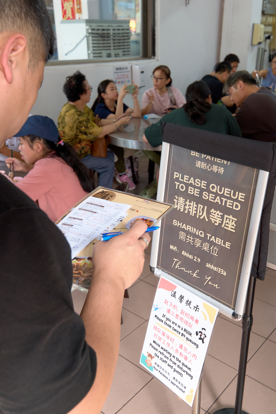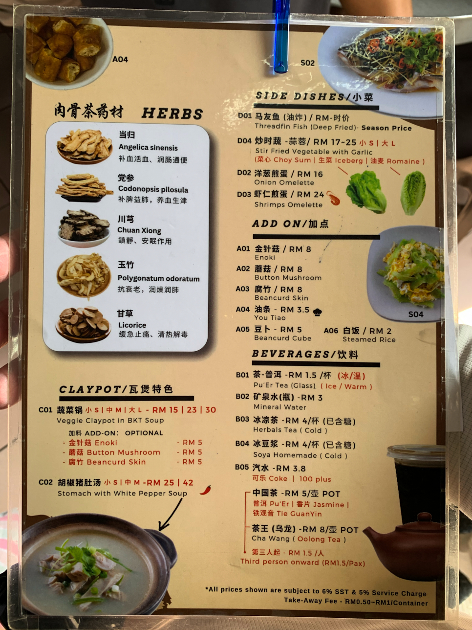 우리 가족의 말레이시아 여행에서 마지막 식사는 Ah Hei Bak Kut Teh阿喜肉骨茶였다. 바쿠테 맛집으로 미슐랭 가이드로 선정된 집이다. 가게에 도착하니 역시나 많은 사람들이 원형 테이블에 앉아 식사 중이고, 대기자도 꽤 있었다. 가게의 정면은 문이 없이 뚫려 있고 중앙에 안내, 메뉴 입간판이 놓여 있고 매니저가 주문과 자리 안내를 해준다.