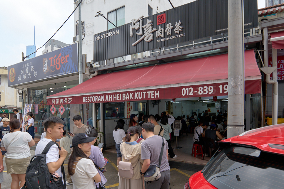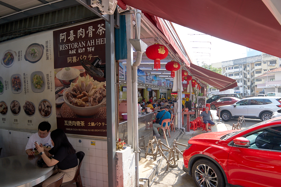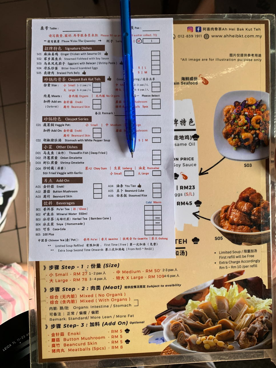 우리 가족의 말레이시아 여행에서 마지막 식사는 Ah Hei Bak Kut Teh阿喜肉骨茶였다. 바쿠테 맛집으로 미슐랭 가이드로 선정된 집이다. 가게에 도착하니 역시나 많은 사람들이 원형 테이블에 앉아 식사 중이고, 대기자도 꽤 있었다. 가게의 정면은 문이 없이 뚫려 있고 중앙에 안내, 메뉴 입간판이 놓여 있고 매니저가 주문과 자리 안내를 해준다.
