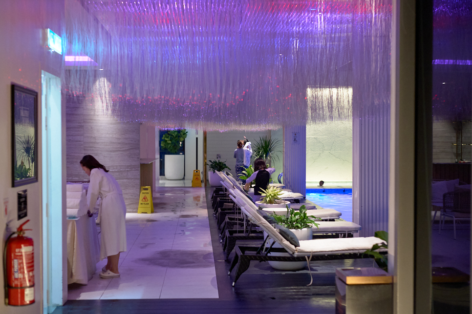 수영하지 않는 사람 입장에서 이곳 수영장은 제일 이쁘지 않았다. 하지만! 신관과 구관 연결하는 위치의 수영장 바닥이... 투명하다! 14층(구관은 꼭대기 층)의 수영장에서 아래를 보면 G층 땅이 보인다. 입구에서 올려다보면 투명한 수영장의 바닥을 볼 수 있다. 아내는 무서와서 한번 가고 딸아이는 한참을 그곳에서 놀았다. 이상하다.... 분명히 겁 많은 아인데....