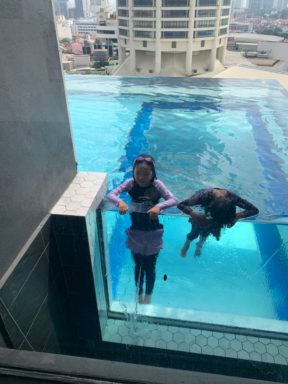 수영하지 않는 사람 입장에서 이곳 수영장은 제일 이쁘지 않았다. 하지만! 신관과 구관 연결하는 위치의 수영장 바닥이... 투명하다! 14층(구관은 꼭대기 층)의 수영장에서 아래를 보면 G층 땅이 보인다. 입구에서 올려다보면 투명한 수영장의 바닥을 볼 수 있다. 아내는 무서와서 한번 가고 딸아이는 한참을 그곳에서 놀았다. 이상하다.... 분명히 겁 많은 아인데....