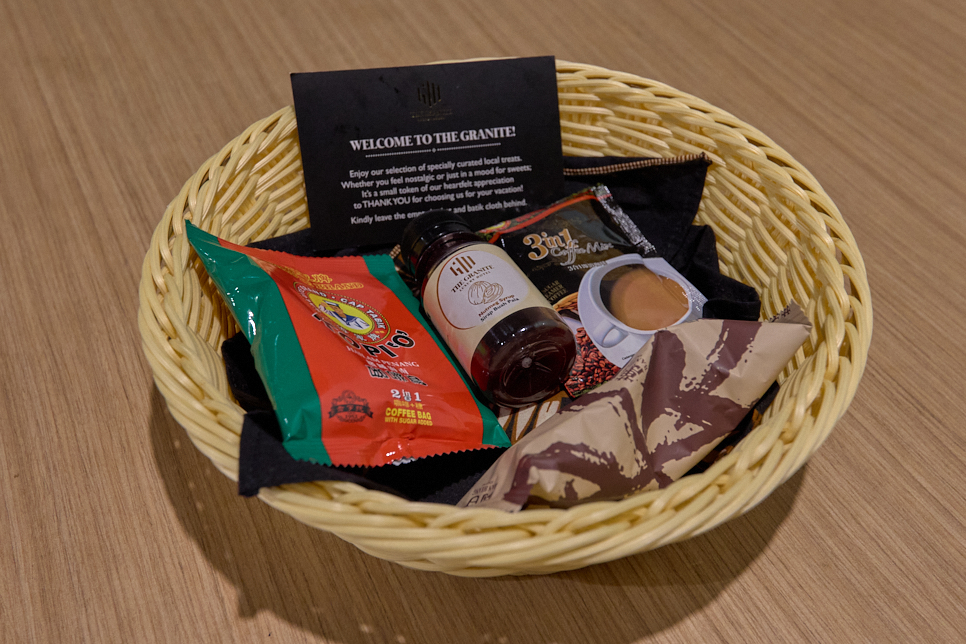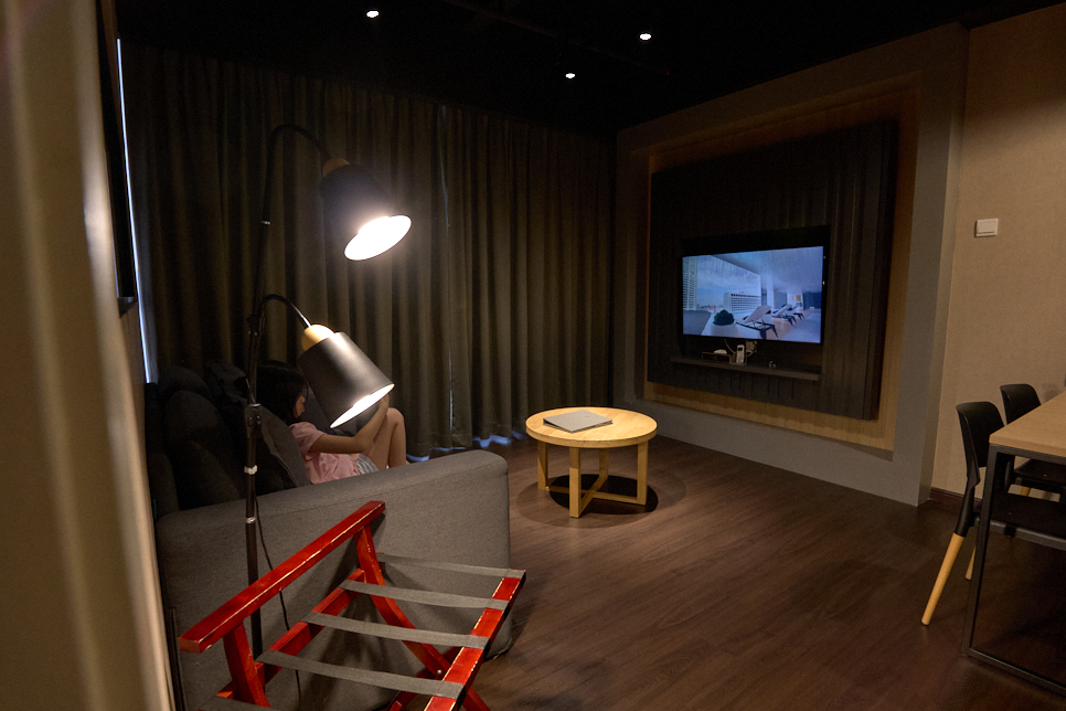 거실 전면 창 뷰는 콤타 타워인 객실에 묵었다. 넓은 거실과 침실은 분리, TV와 에어컨이 각각 설치돼 있었다. 싱크대와 전자레인지와 전기포트, 접시, 포크 등 있어서 간단한 음식은 가져와서 먹을 수 있었다.