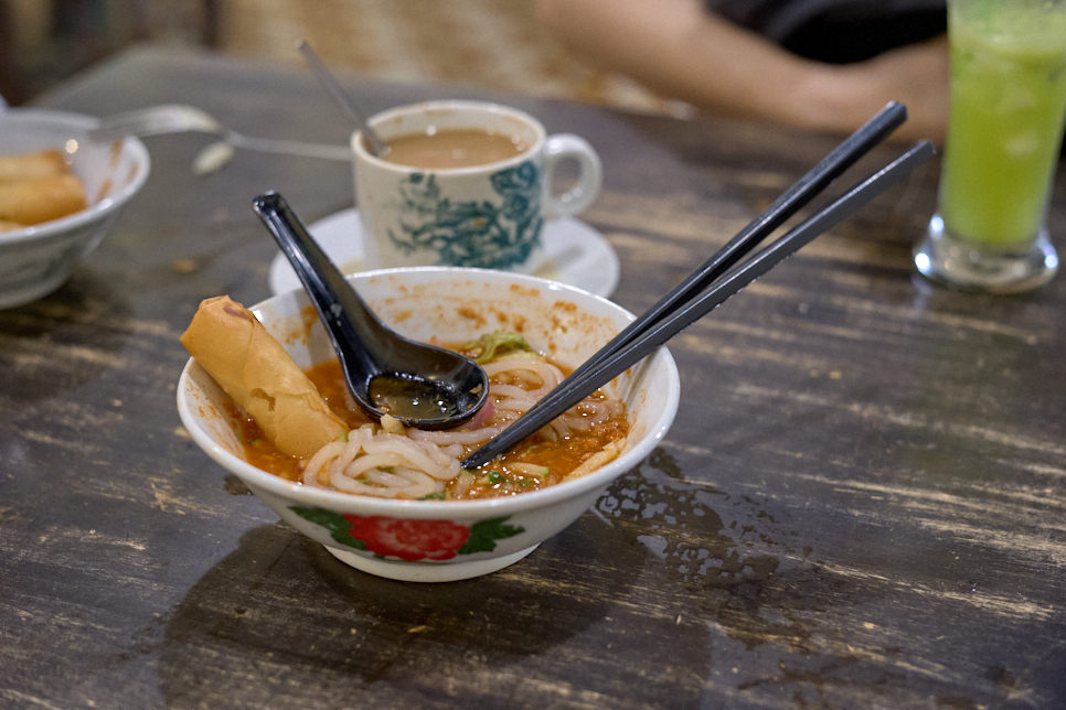 다음날, 가족과 아침으로 가볍게 먹기 위해서 방문했다. 점심을 생각해 둔 곳이 있어서 일단 아쌈 락사의 맛만 보기 위해 들린 것이다. 나는 음식 맛의 거의 반 정도는 보이는 맛이라고 생각한다. 사진이나 유튜브로 본 아쌈 락사의 빨간 국물이(매운 것을 좋아하지 않는다) 맘에 들지 않았고, 형체를 알아볼 수 없는 건더기 가득한 국물도 맛있어 보이지는 않았다. 그래도 현지 유명한 음식은 한 번씩 먹어봐야 한다고 생각하기에 방문했다. 미슐랭 가이드에 선정된 집이 아니던가!