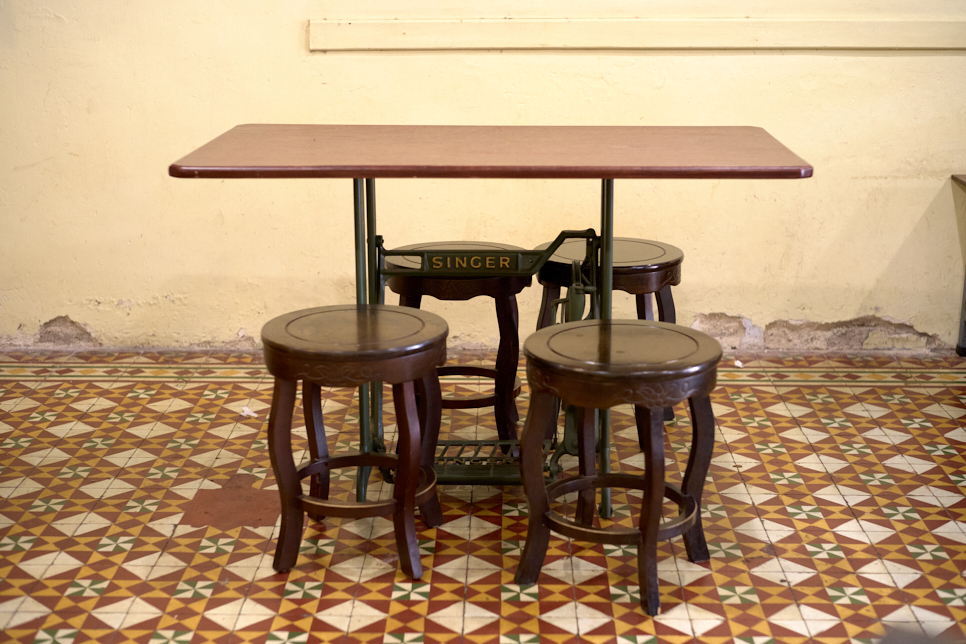 젊은 사장님께서 아쌈 락사와 스프링롤春卷, Spring Roll, 사과 주스를(아이용) 추천해 주셨다. 곧이어 연세 지긋하신 아주머니와 아저씨께서 왔다 갔다 하시며 친절히 맞아주셨다. 우리는 노부부와 아들이 식당을 운영하고 있다는 생각을 했다. 아주머니께서는 손주 생각이 나시는지 딸아이가 구경하러 돌아다니면 따라다니시며 이것저것 설명해 주셨다. 우리를 제외한 손님이 없었기에 나도 편하게 이곳저곳을 사진으로 남길 수 있었다. 우선 미슐랭 로고가 보인다! 기대된다. 큰 테이블의 모습이 좀 이상하다. 재봉틀에서 상부분만 떼어내서 사용하고 있었다. 가게 안쪽을 보니 재봉틀의 기계 부분이 분리된 것이 보인다. 벽에 그려진 그림을 배경으로 아내와 딸의 사진을 몇 장 남긴다. 그림 잘 그렸다.
