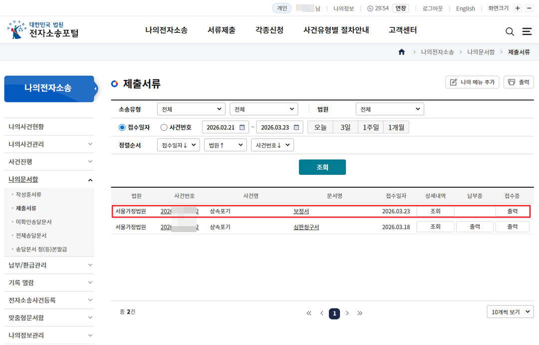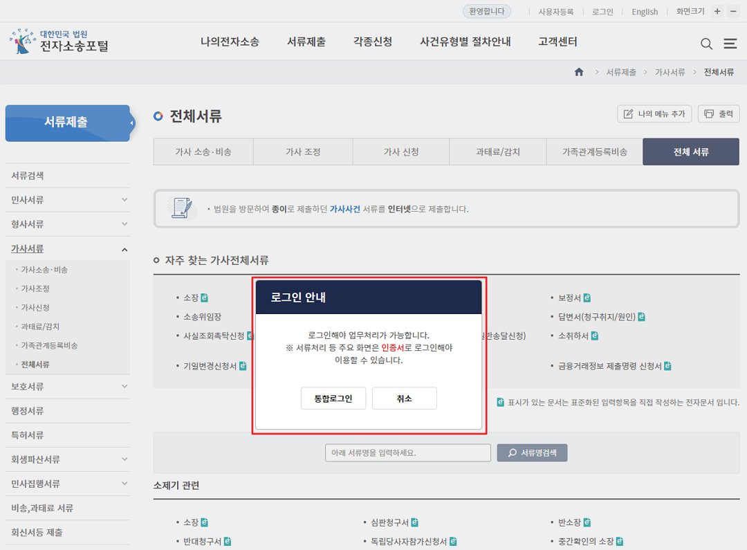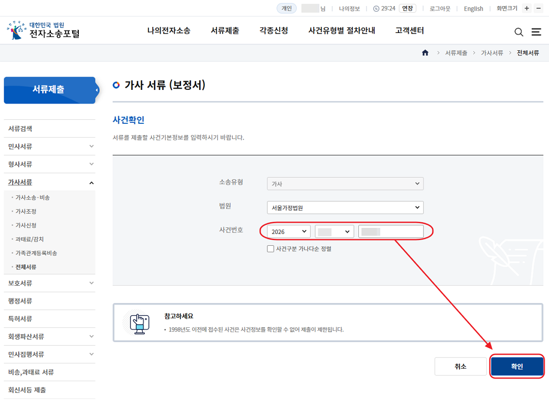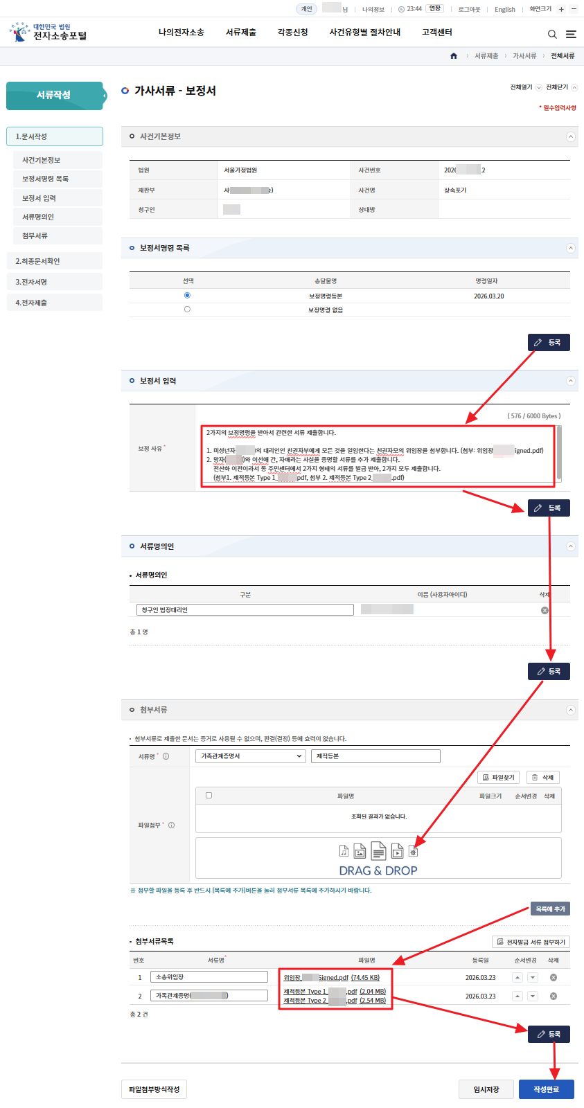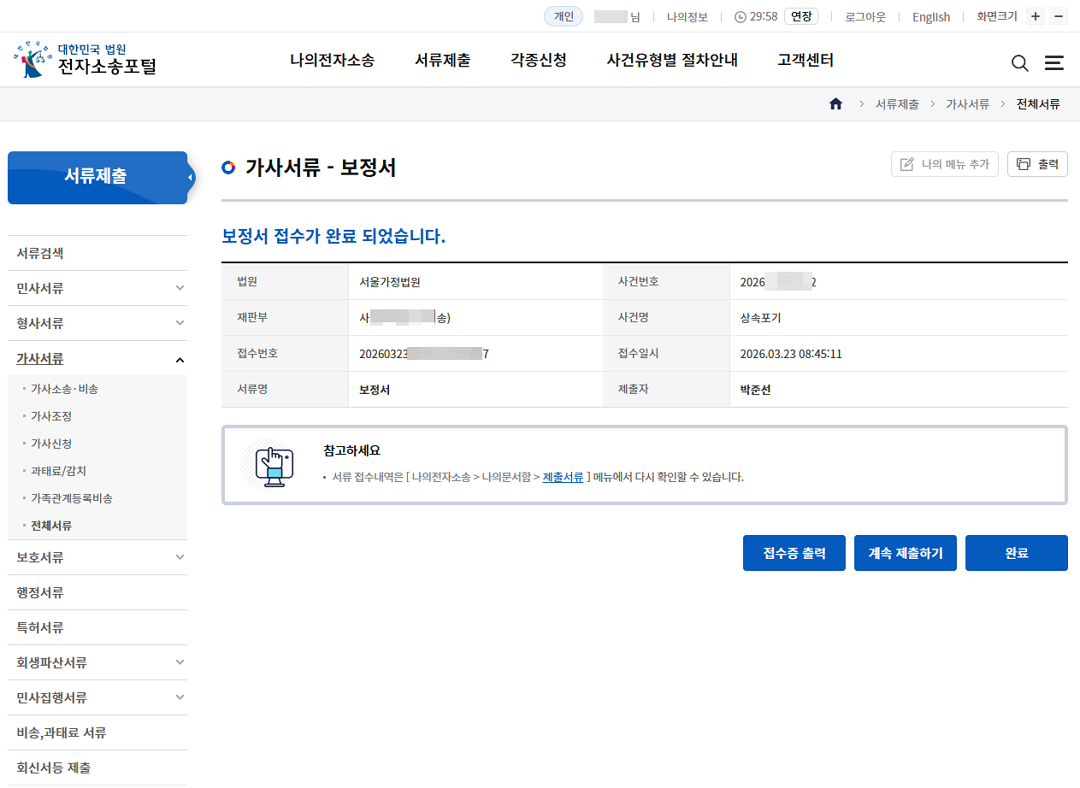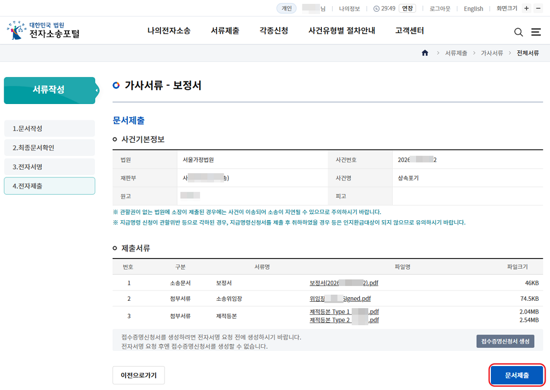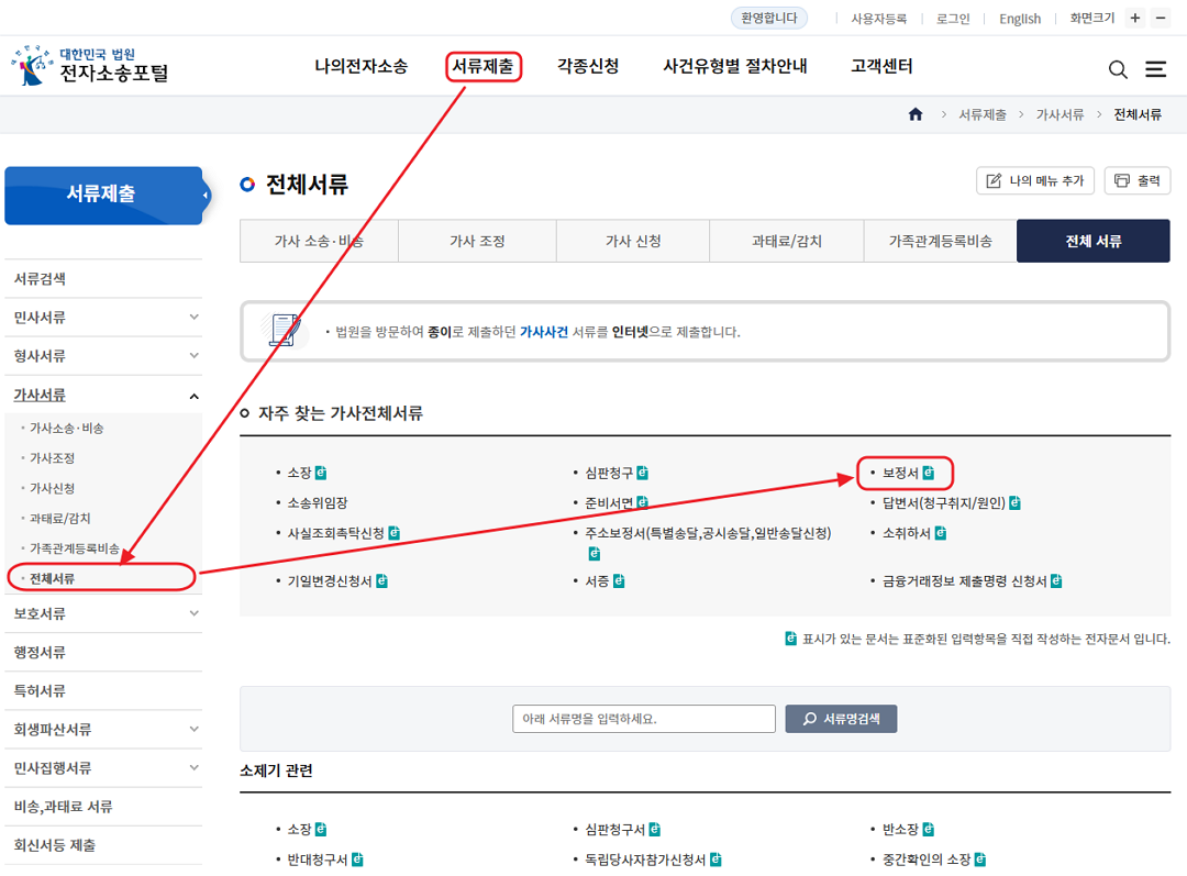 서류제출 → 가사서류 → 전체서류 화면에 접속하여 보정서를 클릭하면 보정서를 작성하고 제출하는 화면으로 이동한다. 이 메뉴는 로그인을 해야 접근이 가능하다.