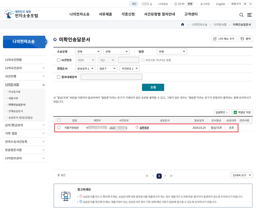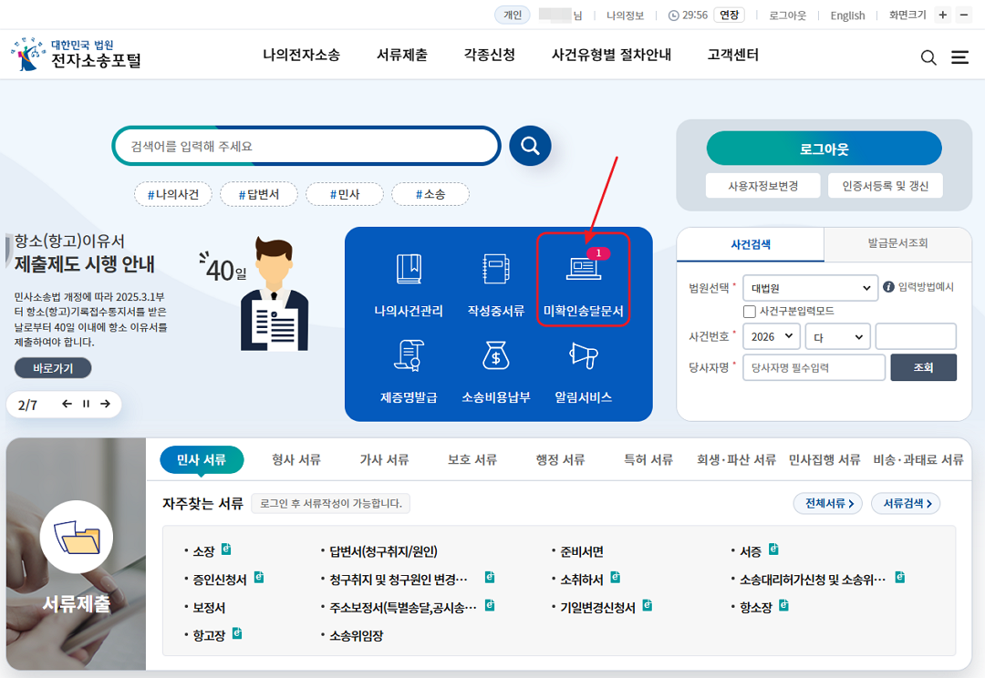 전자소송포털 초기화면 중간에 '미확인송달문서'에 빨간색 '1'이 표시돼 있다. 클릭해서 이동한다.