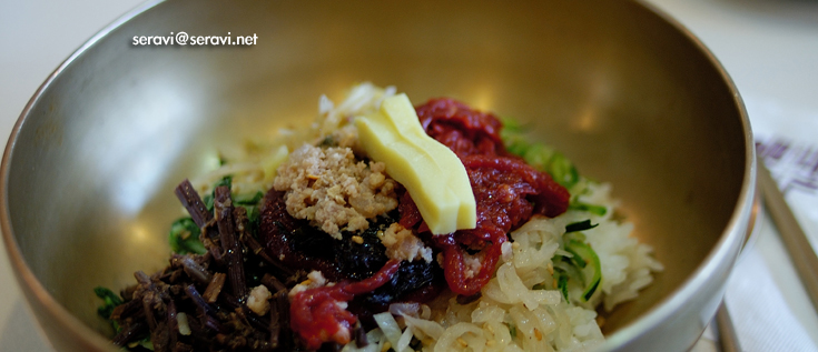 맛은 뭐랄까... 내 입맛엔 좀 아니올시다이다. 꼬들꼬들한 밥을 좋아하는 내겐 너무 질퍽거린다. 육회를 빼고 싶었지만 옆에 앉은 꼬마앞에서 다 늙은 젊은이가 편식할 수도 없고. 하여간 육회 첨 먹어봤다.