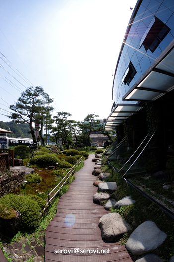 우리가 도착 삐~(특정상호)가든은 꽃밭과 건물 주위로 산책로를 만들어놓아 빨리 밥먹은 사람은 나와서 한바퀴 돌아봐도 될 듯. 건물 중간은 대나무를 싶어놓고 천장은 일관이 들어오도록 해 놓았다. 신경썼다.