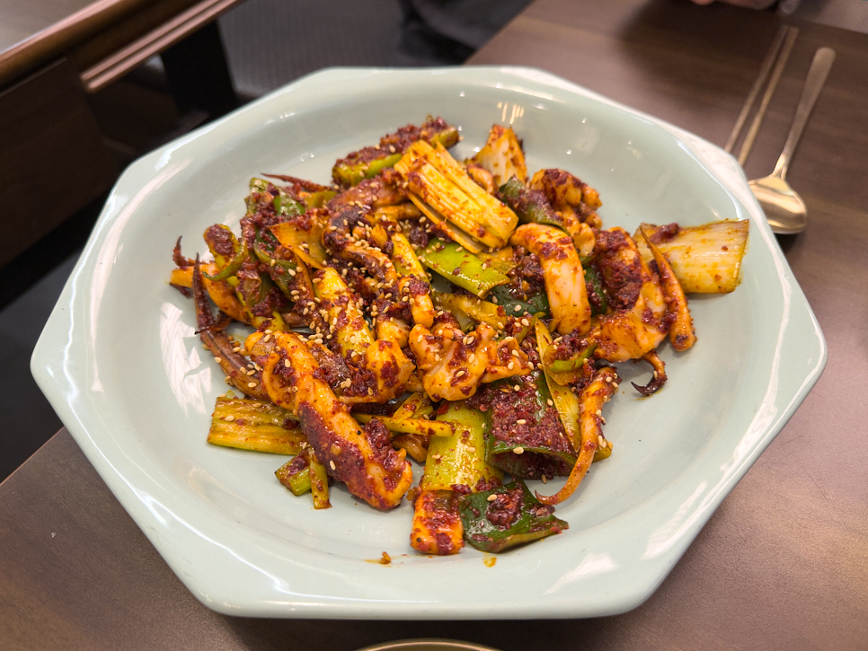 9,900원이라는 가격이 진짜 믿기지 않는다. 싱싱하고 탱탱한 오징어에 대파를 숯불에 구워서 내줬는데, 싱싱함, 양념, 양 어느 하나도 빠지는 게 없다. 결국 이거 하나로 두 명이서 소주 한 병씩을 비워버렸다. 안주로서 완벽하다는 뜻이다.