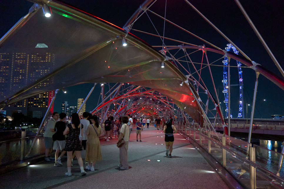 다리의 시작은 ArtScience Museum 옆이었다. 넓은 연꽃 같은 건물을 지나 The Helix Bridge에 들어섰다. 넓은 다리이며, 머리 위로 얇은(?) 틀에 조명이 빛나고 있다. 이쁜 것 같기도 하고, 아닌 것 같기도 하고. 기대했던 거보다 이쁘진 않았다. 멀리서 봐야 이쁜 다리 갔다. 쿠알라룸푸르의 살로마링크Saloma Link Bridge는 살아있는 물고기 몸통 안을 지나는 느낌이었다면 The Helix Bridge는 뼈만 남은 공룡 몸 안을 지나는 느낌???