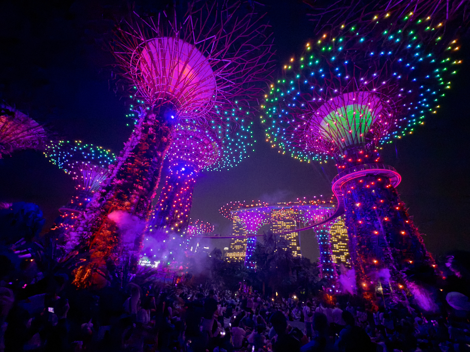 스펙트라 쇼는 음악도 크게 듣고, 화려한 볼거리를 위해서 마리나 베이 샌즈 앞에서 보는 게 좋을 것 같다. 가지고 간 카메라의 화각으로는 전체가 잡히진 않아, 스마트폰의 광각으로 찍으니 한 화면에 찍을 수 있었다.