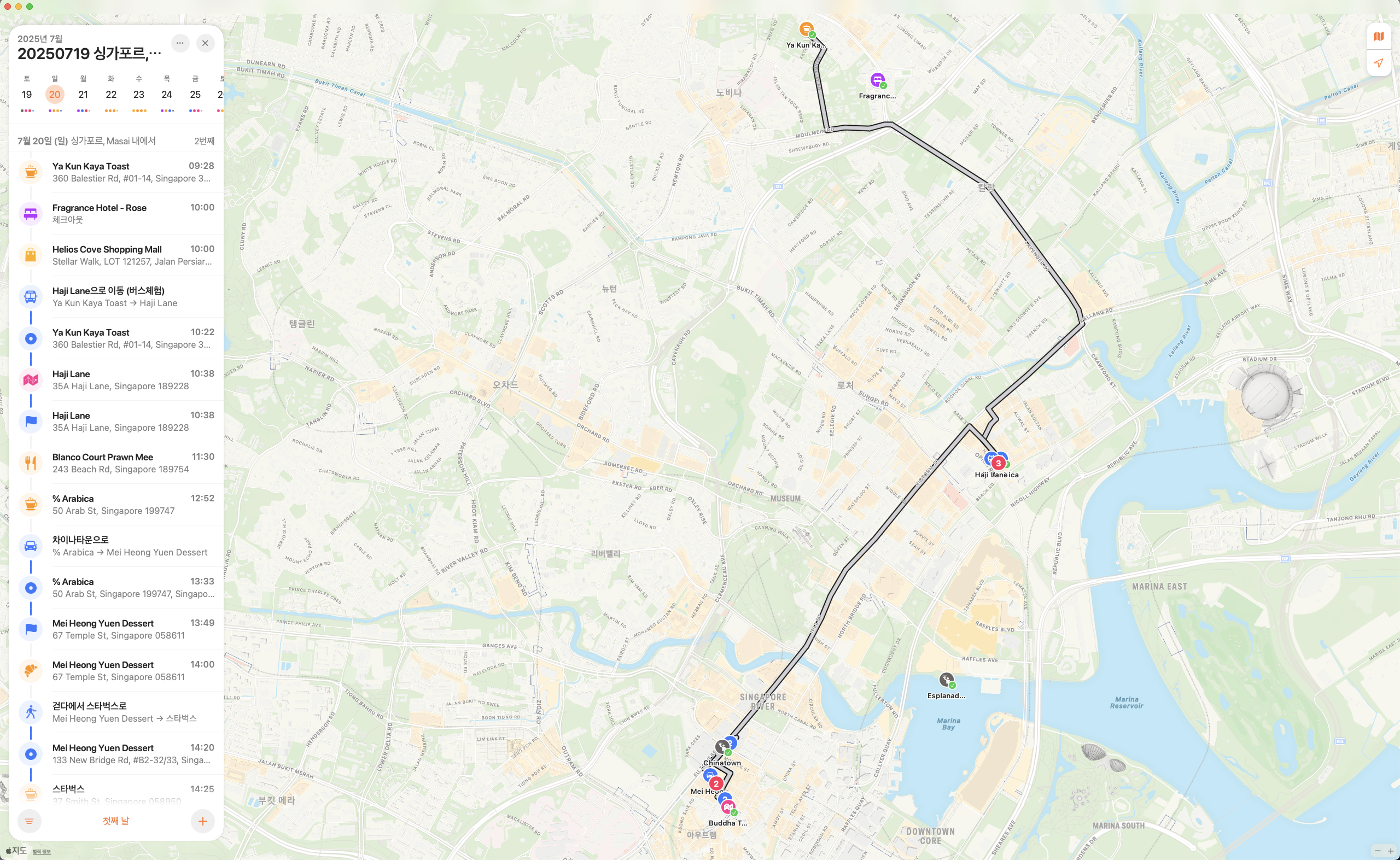 아침이 밝았다. 숙소에서 멀지 않은 곳에, 야 쿤 카야 토스트Ya Kun Kaya Toast가 있다. Shaw Plaza에 있는 야 쿤 카야 토스트에서 첫 아침 식사를 하고, 아랍 스트리트(with 하지 레인)와 차이나타운, 마리나 베이 샌즈, 슈퍼트리 그루브와 머라이언 공원을 도는 거로 일정을 바꿨다. Singapore Flyer와 라우파삿도 가능하다면 방문하고 싶었다.