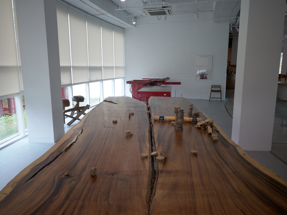 카페 옆으로 카카오를 로스팅하는 공간이 있다. 이곳의 실내도 작품이다. 커피콩은 볶는 걸 알고 있었는데 카카오 역시 콩 형태이고 볶아야 하는 모양이다. 볶기만 하는 것이 아니고 초콜릿을 만들기까지 하는 공간이라 한다. 테이블이 초콜릿 포장 형태로 돼 있다.