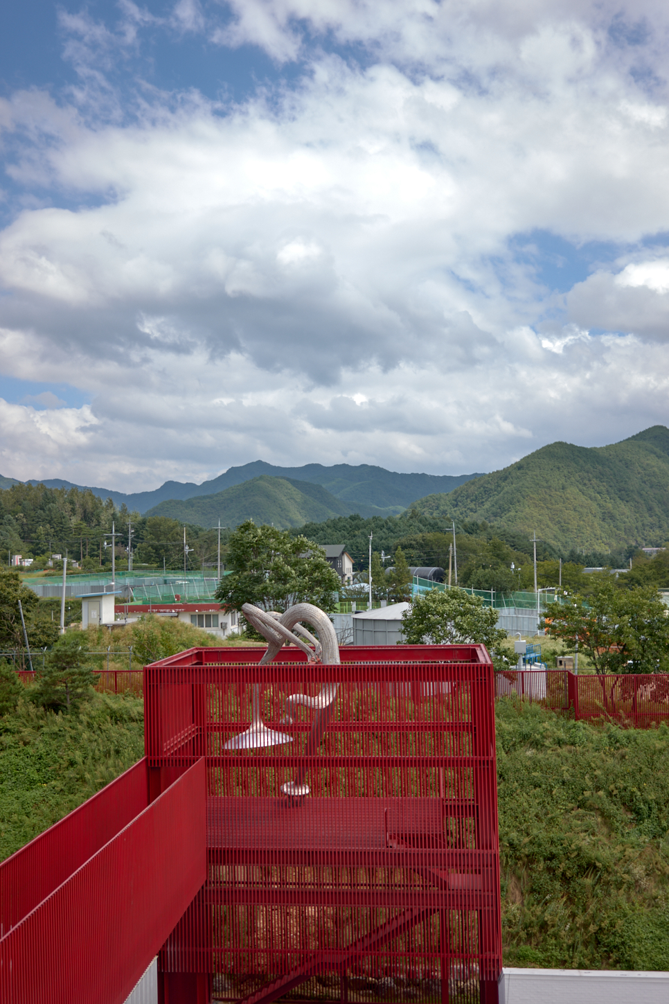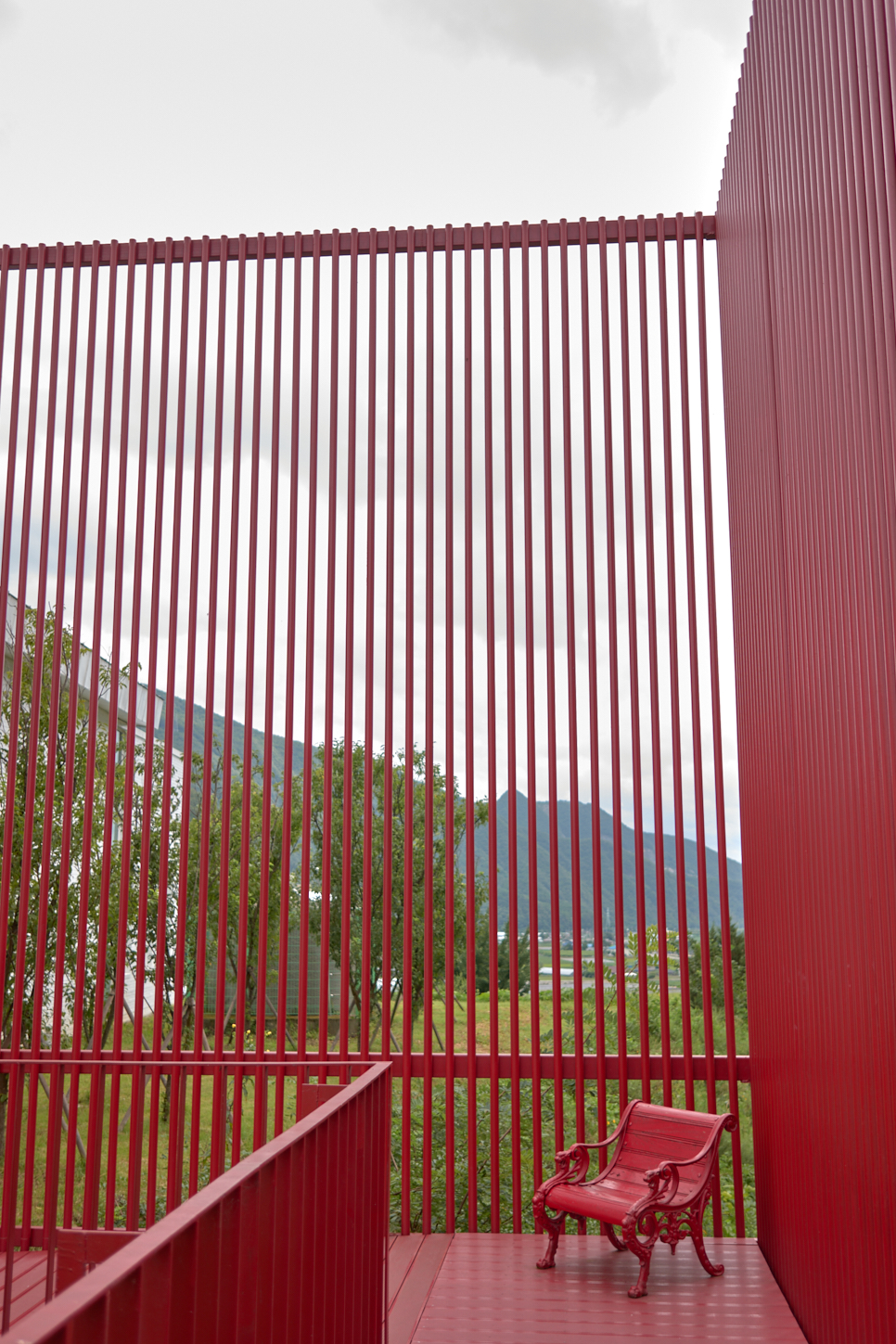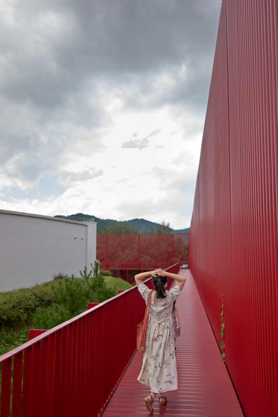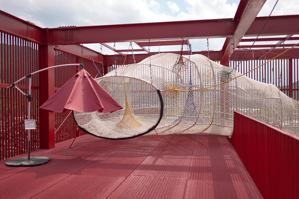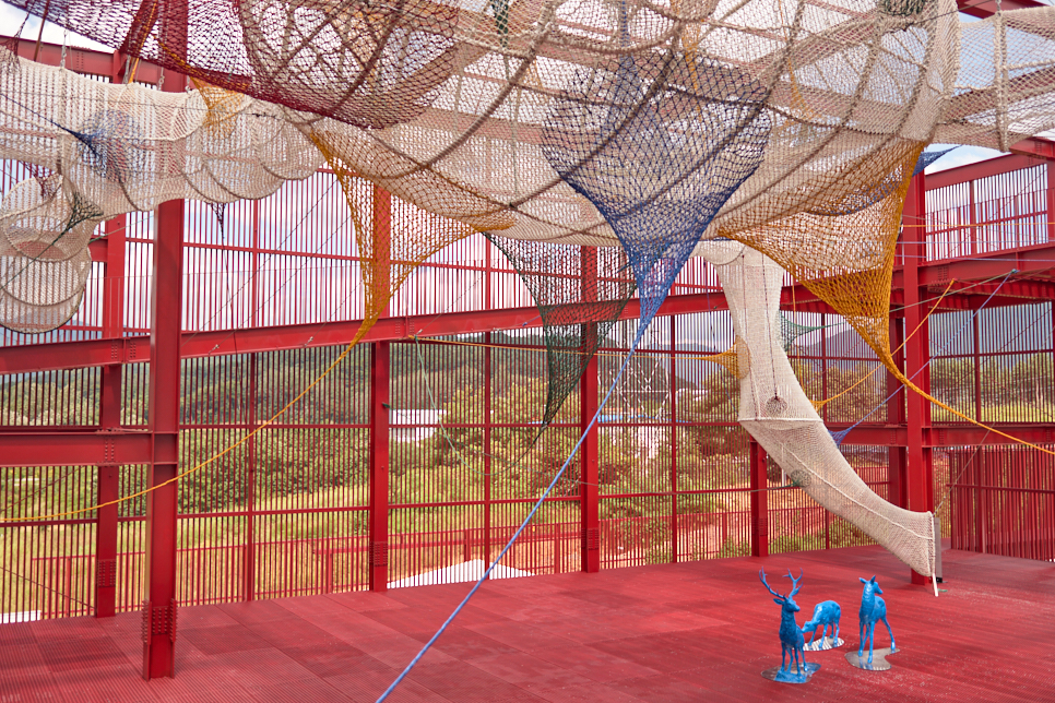 미술관은 독립된 건물과 파이프로 만든 파빌리온, 그리고 그사이의 길로 만들어져 있다. 하얀색 건물 사이 강렬한 붉은 색을 보다 이 녹색 길을 쉬엄쉬엄 거닐며 미술관을 넓은 눈으로 바라보는 시간을 가지게 된다. 하늘로 올라가려는 이무기도 보이고, 무리에서 뛰쳐나온 푸른 사슴 한 마리도 볼 수 있다. 저기 나무로 만든 곳은 아마 목성임에 틀림없다.