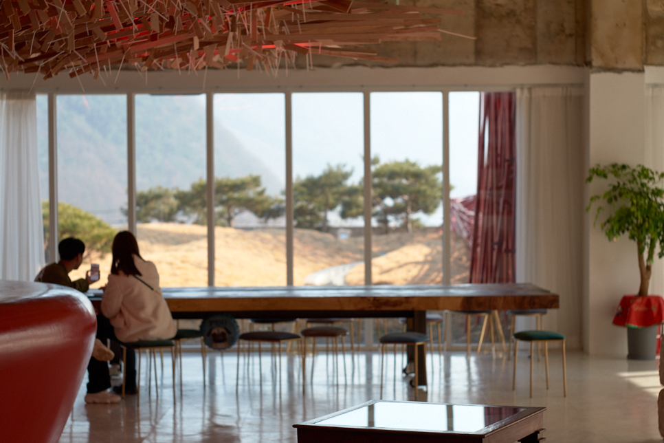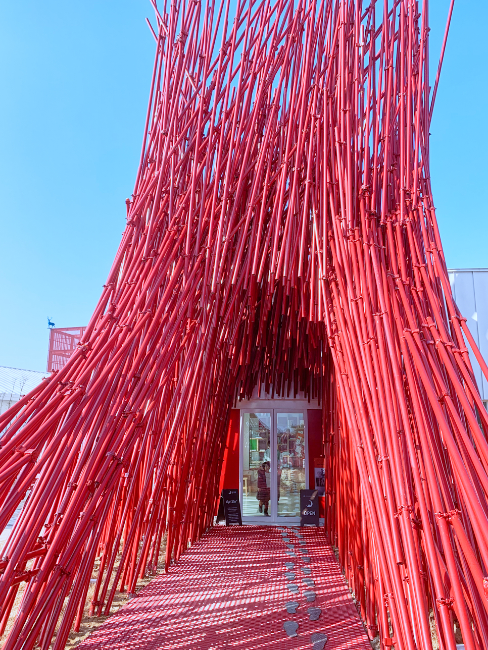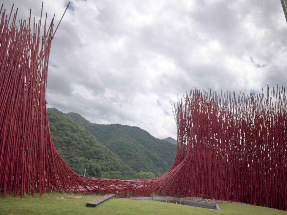 강원도 영월군 주천면에 있는 펜션을 몇 차례 이용하기 위해서 오가면서 높고 빨간 구조물이 눈에 들어왔다. 새빨간 장대가 높이 솟아있어서 나의 궁금증을 자아내기에 충분했다. 검색해 보니 미술관임을 알았다. 이름은 ‘젊은달 와이파크’. 첫 방문은 어떻게 생긴 곳인지 궁금해서 방문했었다. 궁금증을 자아내던 새빨간 장대는 대나무를 표현한 미술관장의 작품이라는 것을 알았다. 그냥 미술관이 아님을 알았다. 장대를 통과해서 기념품 판매와 카페를 함께 운영하는 안내소로 갔고, 대략의 정보를 얻고 다시 돌아왔다. 아마 입장료와 관람 시간 때문이었던 것 같다.