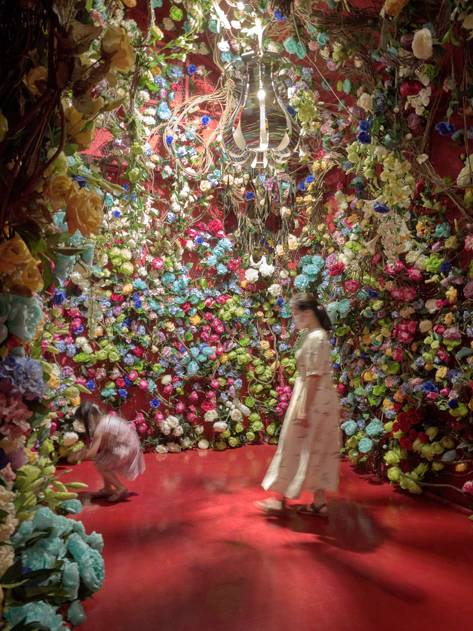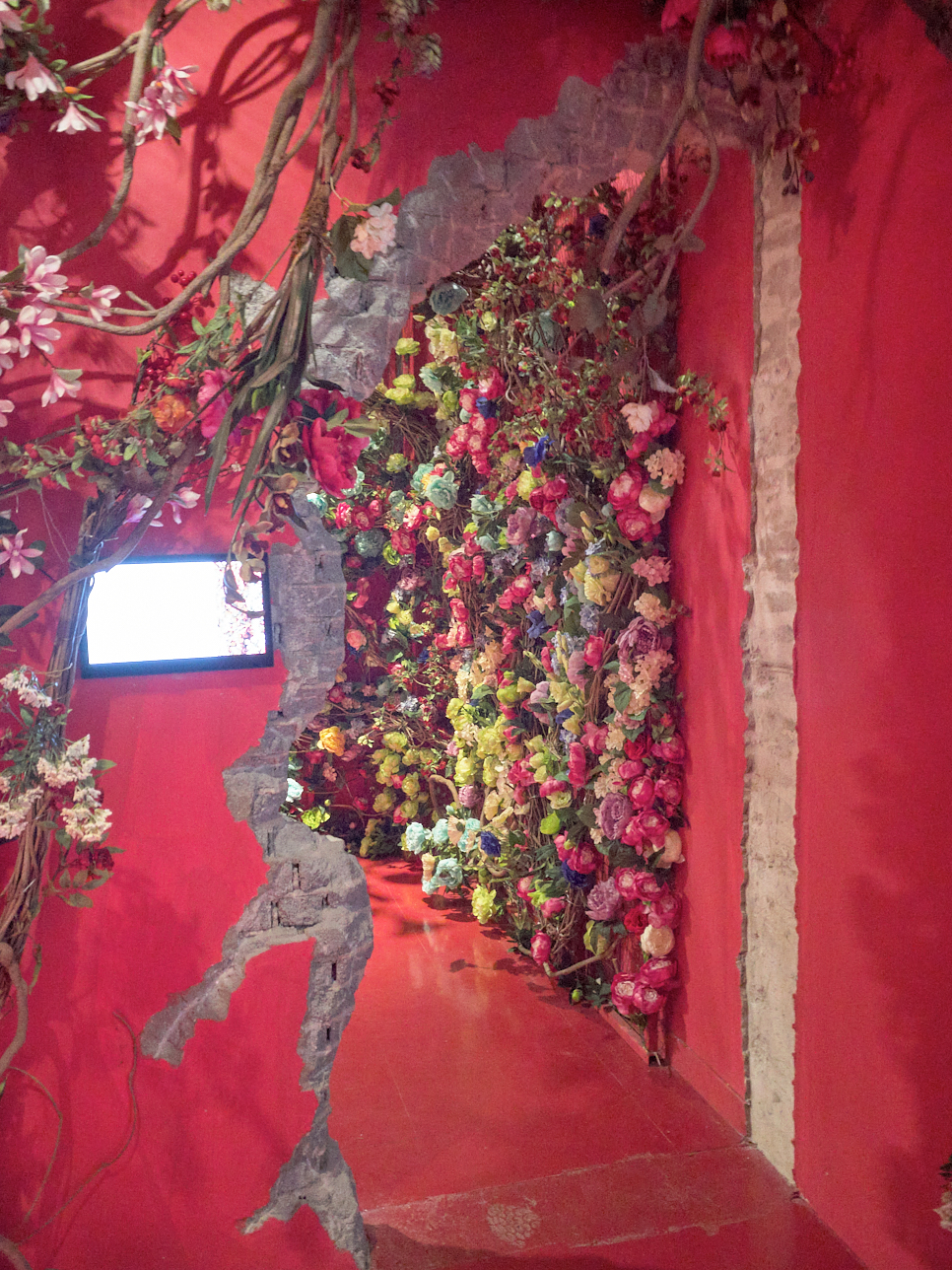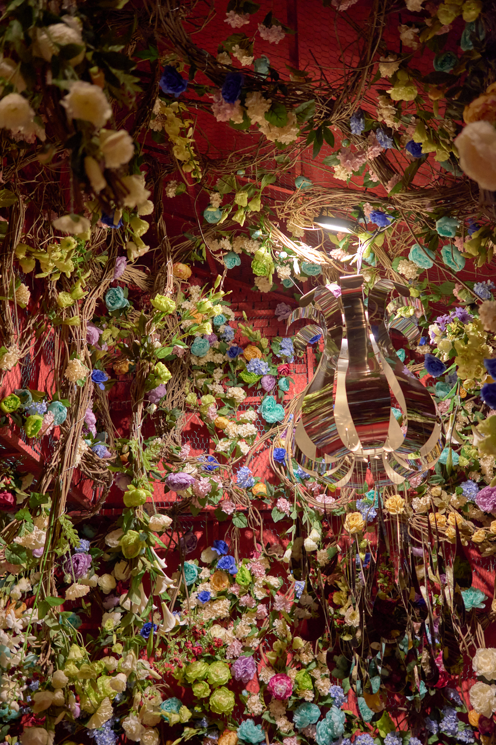 꽃으로 벽과 천장이 꾸며져 있다.