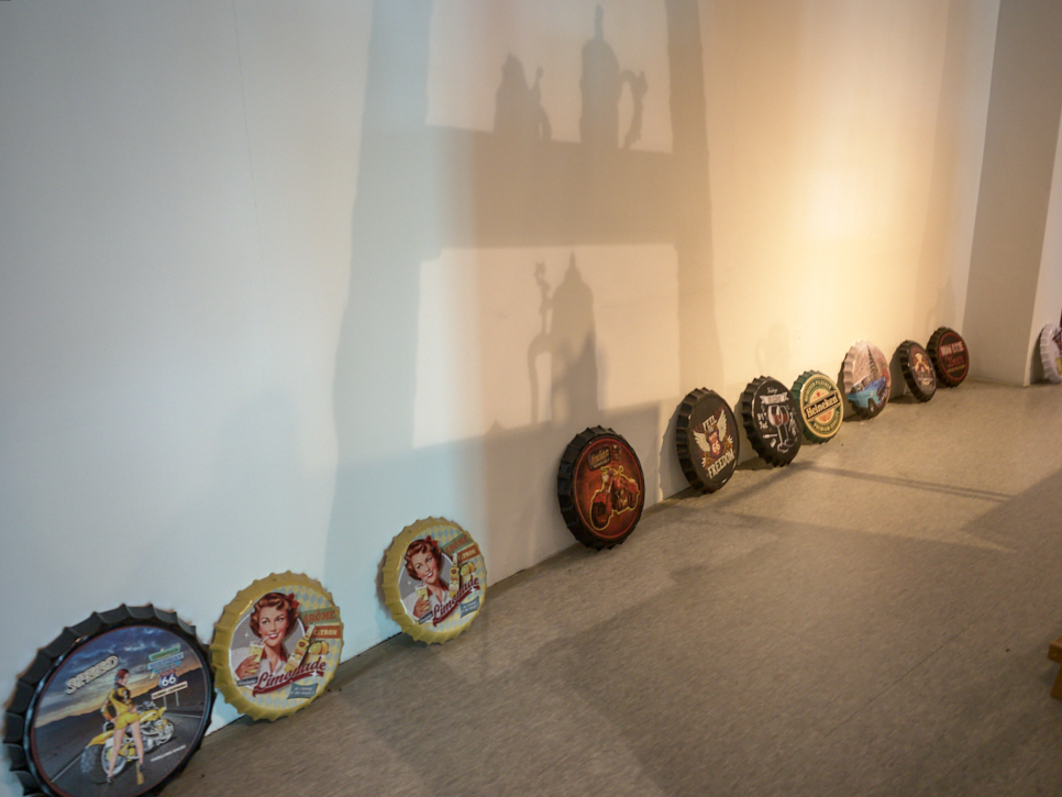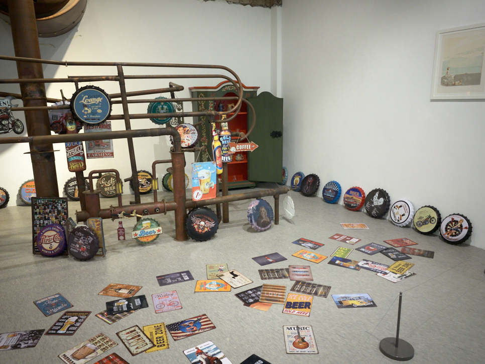 우리 전통의 자재장이 설치된 곳이 보인다. 뒤로는 동으로 만든 것 같은 탱크와 파이프가 보인다. 오래전 강남역 근처 맥주를 만들어서 파는 곳에서 본 시설 같다는 생각이 들어 다가가 보니 맞았다. 자재장이 놓인 곳에는 세계 여러 나라의 맥주잔이 펼쳐져 있다. 자개장과 맥주잔..... 맥주와 관련한 소품(실제로는 크다)들이 펼쳐져 있다. 이곳에서 건너편 창밖을 보며 맥주를 마실 수 있게 해도 괜찮을 것 같았다.