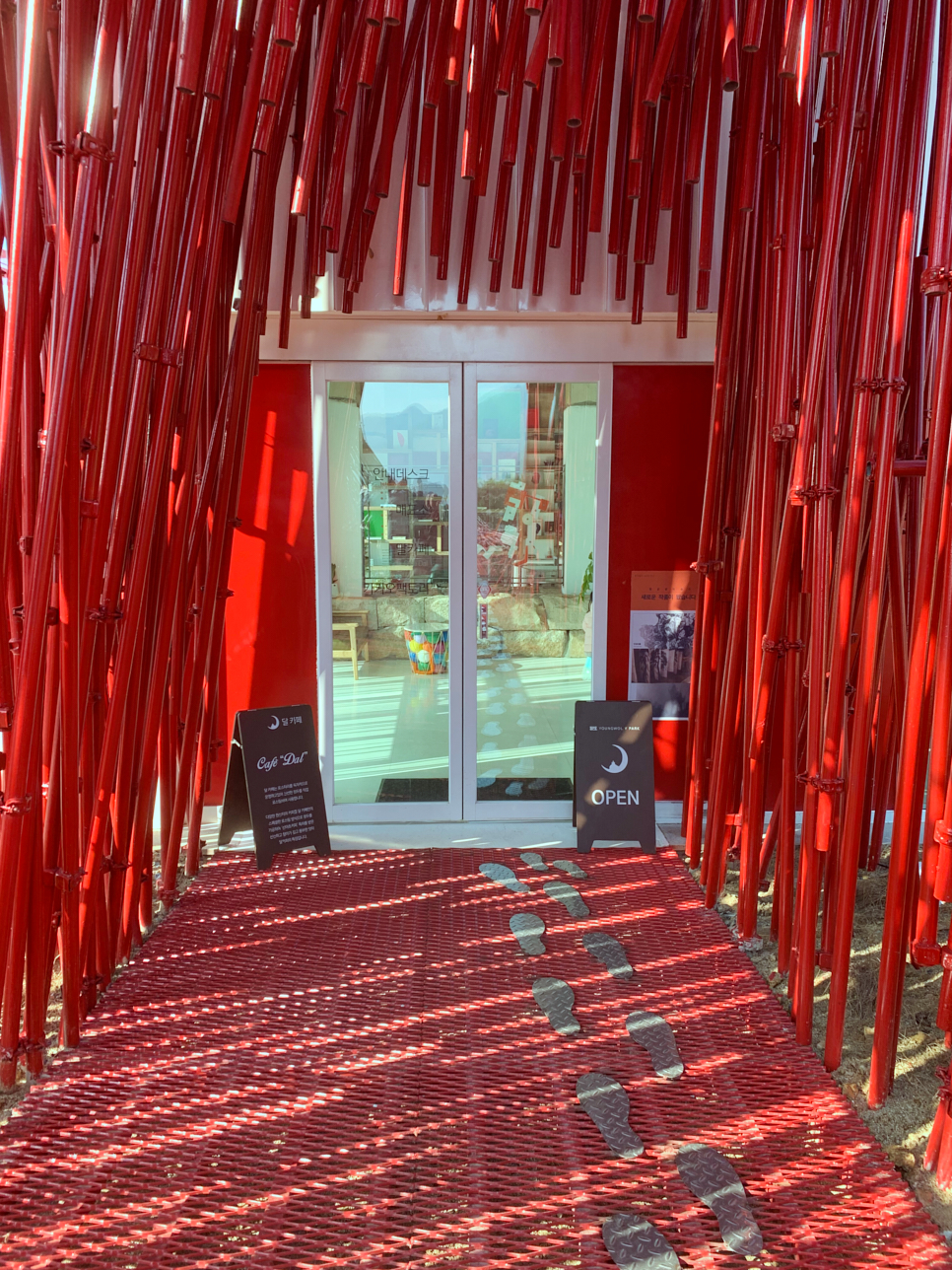 차를 주차하고 나니 멀리서 보이던 그 붉은 장대가 우리를 압도했다. 관장이신 최옥영 작가의 설치미술작품 ‘붉은 대나무’라고 하며, 이 작품을 통해서 ‘젊은달 와이파크’에 들어갈 수 있다. 작품 붉은 대나무는 강릉江陵의 오죽烏竹과 주천酒泉과의 연결고리로 소재를 대나무로 하고, 영월의 색인 녹색과 가장 대비하는 붉은 색의 금속파이프를 이용해서 표현했다고 한다. 붉은 대나무는 하슬라카페 달까지 이어진다. 입장을 위해서는 이곳을 지나야 한다.