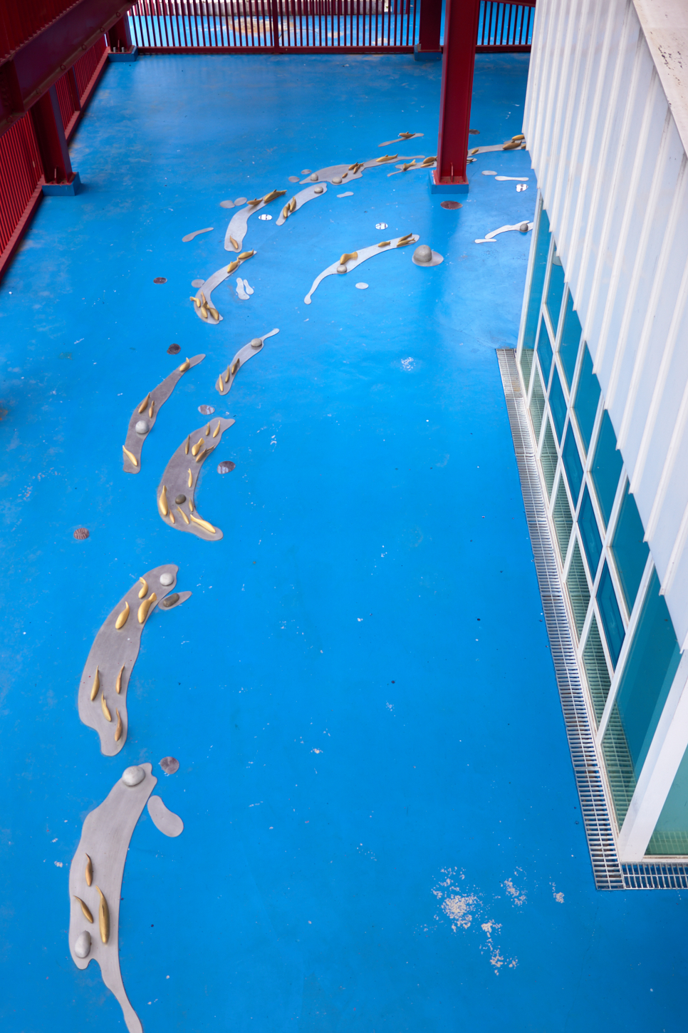 직전 천장에 은색의 각진 금속들이 천장에 달린 것을 보았다. 일부분만 찍힌 사진밖에 없어서 이 포스트에 기록하지는 못했다. 이 작품은 '실버피쉬'이다. 역시 이곳저곳이 작품인데 작품을 보는 눈이 없는지 보고만 지나쳤다. 이 길을 따라 전시관 모퉁이를 돌아설 때쯤부터 바닥에 누가 봐도 물고기를 표현한 작품이 보인다. '황금물고기'이다. 이 물고기들을 따라서 다음 전시물, 아니 체험시설로 올라가 보자.