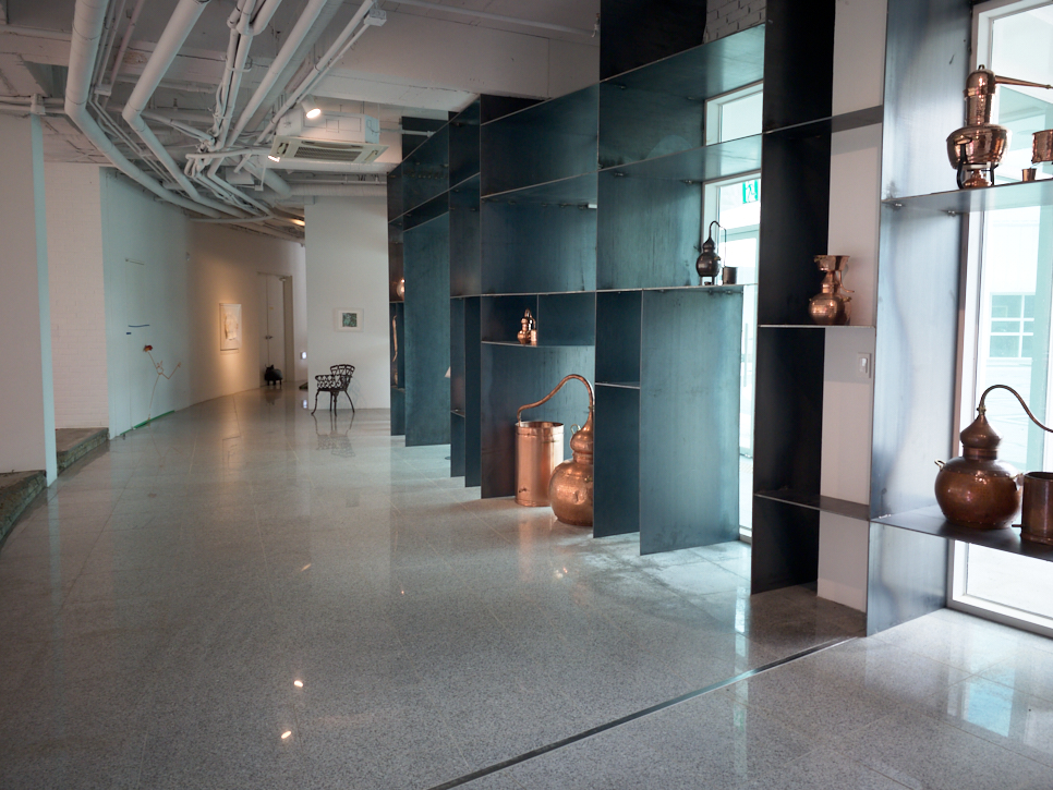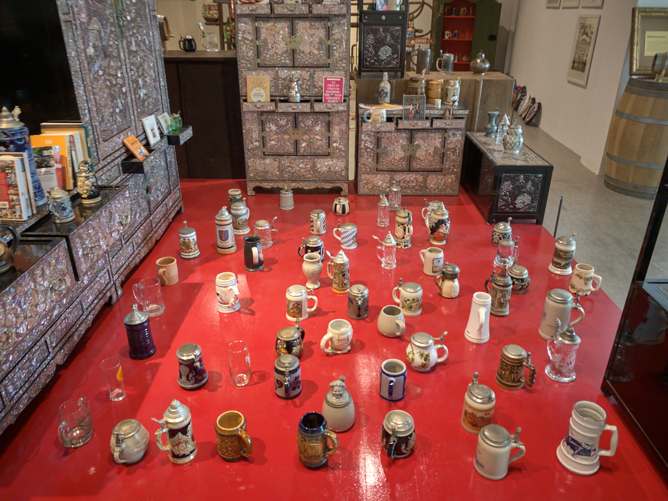우리 전통의 자재장이 설치된 곳이 보인다. 뒤로는 동으로 만든 것 같은 탱크와 파이프가 보인다. 오래전 강남역 근처 맥주를 만들어서 파는 곳에서 본 시설 같다는 생각이 들어 다가가 보니 맞았다. 자재장이 놓인 곳에는 세계 여러 나라의 맥주잔이 펼쳐져 있다. 자개장과 맥주잔..... 맥주와 관련한 소품(실제로는 크다)들이 펼쳐져 있다. 이곳에서 건너편 창밖을 보며 맥주를 마실 수 있게 해도 괜찮을 것 같았다.