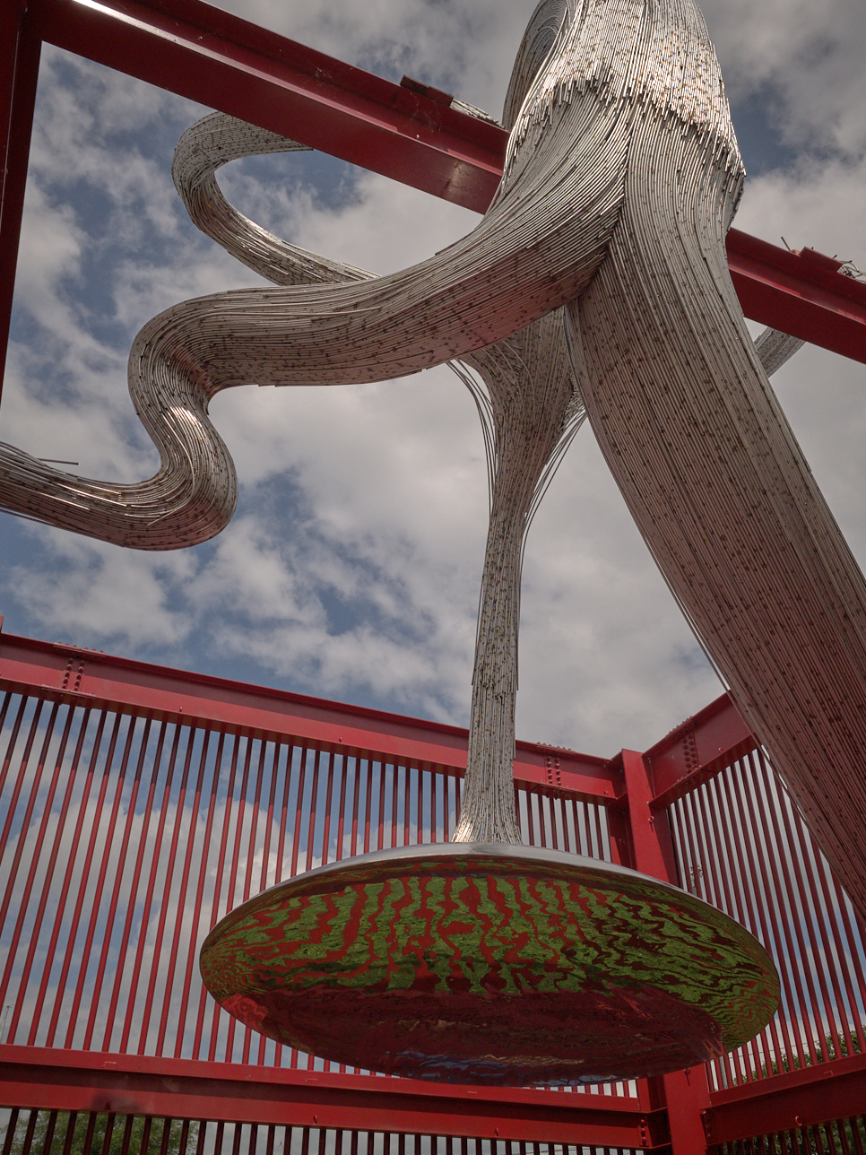 아래 보이는 둥근 원판은 색을 칠한 것이 아니다. 매끈한 원판은 그것을 바라보는 아래의 사람과 주변의 붉은 소재, 바닥 등이 비치며 도마뱀 문양을 연상하게 한다. 내가 움직이면 그 모양도 변해간다.