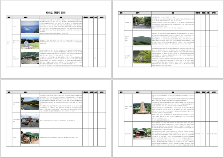 대마도 여행과 관련해서 찾아보니 믿을만한 정보를 찾기가 쉽지 않았다. 검색한 내용을 확인하고 정리해서 목록을 만들었다. 그러고는 지도에 표시하며, 동선을 짜봤다. 기다란 모양의 섬인지라 그리고 보니 동선 설계의 의미가 없었다. 그리고, 방문지 목록과 정보를 대표적 사진까지 정리해서 출력해서 갔다. 갔는데 어떻게 생겼는지 몰라서 못 찾으면 그것도 낭패다. 일어를 못해서 현지에서 얻을 수 있는 정보가 거의 없기에 사전에 알아보고, 정리했다.