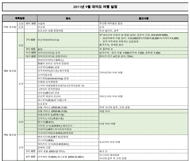 - 2011.9.5 – 토요일 출발을 일요일 출발로 바꾸고, 2박 3일 일정을 3박 4일 일정으로 변경. 계획 변경