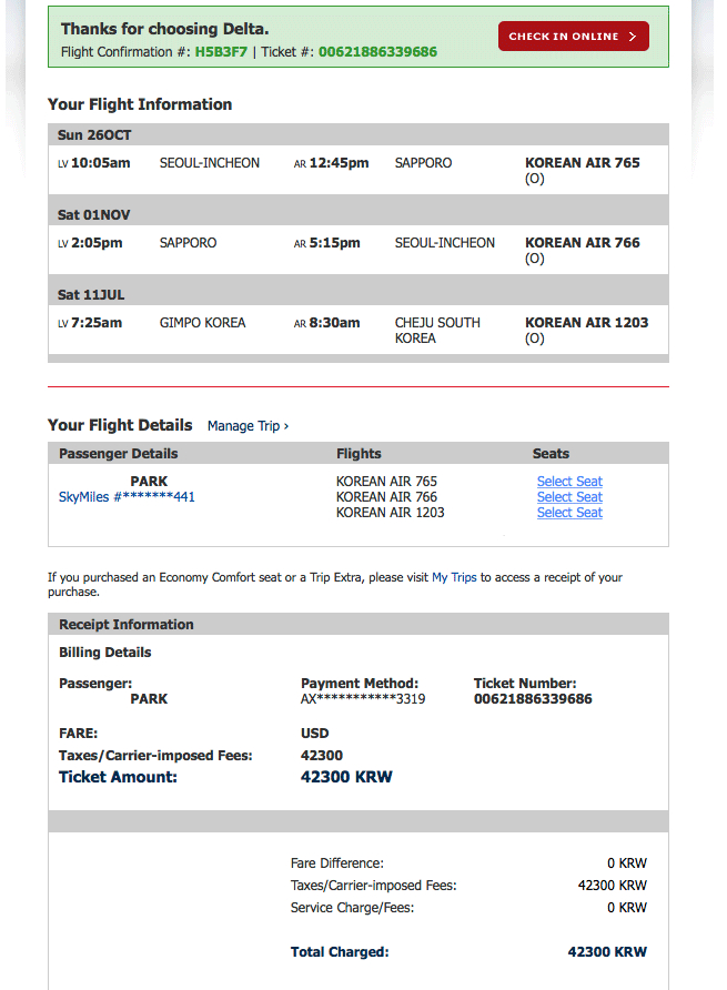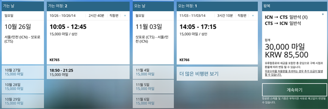 항공권 예약 과정에서 여행자는 매우 영리한 전략을 구사했습니다. 처음에는 대한항공 마일리지로 하코다테 직항을 찾았으나 노선이 없어진 상태였고, 삿포로를 경유하는 방법을 선택하게 됩니다. 여기서 주목할 점은 대한항공 사이트에서 인천-삿포로 왕복이 30,000마일인 반면, 같은 스카이팀 소속인 델타항공 사이트에서는 15,000마일에 유류할증료도 없다는 사실을 발견한 것입니다. 동일한 항공기임에도 예약 채널에 따라 마일리지 요구량이 달라지는 이러한 정보는 많은 여행자들이 놓치기 쉬운 부분입니다.