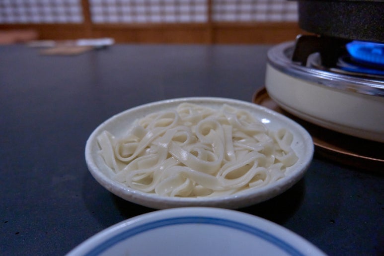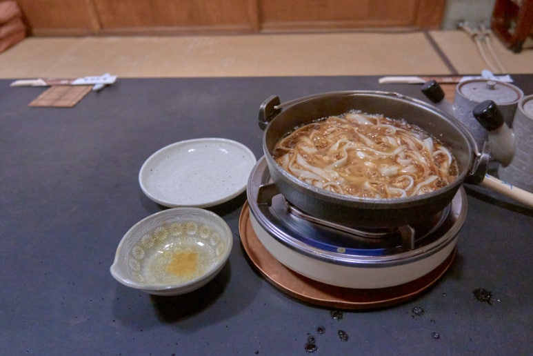풀어주신 달걀도 아주 신선하다 하시고, 고기도 이 정도 상태에서 건져서 먹으라고 정말 친절히 하나하나 알려주신다. 지금 꺼내서 달걀에 찍어서 먹어야 맛있다고 한 점 만들어 주신다. 고기를 다 먹을 때야 식사하라고 하면서 자리를 비켜 주신다. 우동은 추가할 수 있단다. 돈 내란 말이다.