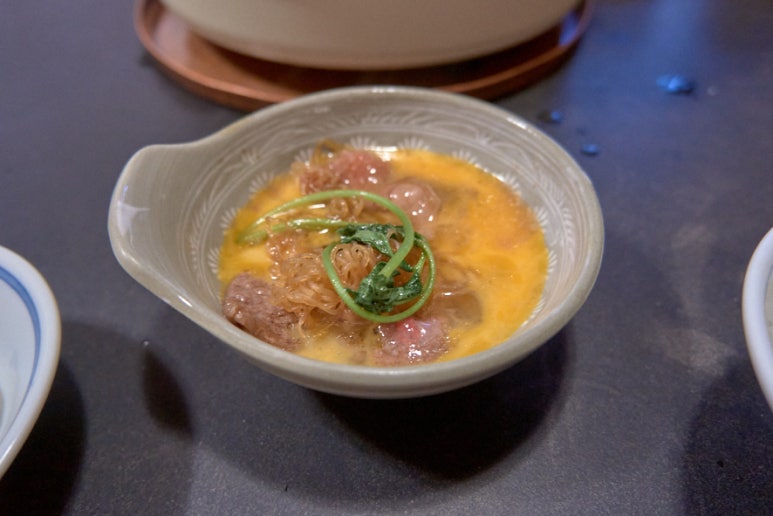 다 익었다. 달걀을 풀어주시곤 그 위에 고기와 채소를 얹어주신다. 이렇게 먹으란다.
