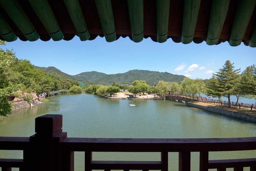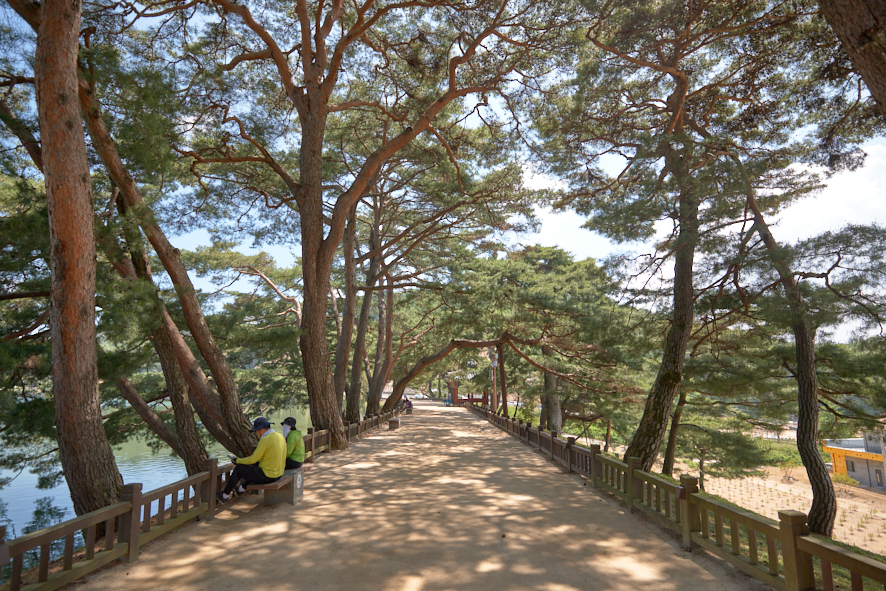 6월 초지만 내리쬐는 햇살은 걷고 싶은 맘을 앗아갔다. 햇볕을 좋아하지 않는 데 모자를 가져오지도 않았다. 늦은 오전이라 태양은 머리 위에 있고, 온도마저 높았다. 혼자라면 어느 식당에 들어가서 반주를 곁들인 식사를 하고 있을 시간이다. 하지만 일행도 있거니와 처음 와본 곳에 대한 호기심과 멀리 보이는 폭포, 잘 꾸며진 다리를 보며, 그들과 발을 맞췄다. 우리는 호수 옆에 차를 댔기에 바로 널따란 저수지가 보였다. 저수지 한쪽에는 작은 섬이 하나 있다. 여기가 의림지인가 보다.