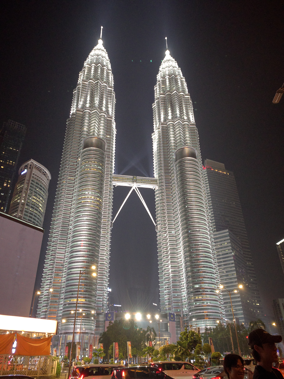 페트로나스 트윈 타워는 1998년 완공, 2004년까지 세계 최고층 건물이었다. 지금도 쌍둥이 빌딩 중에서는 세계 최고의 높이라고 한다. 광화문의 교보빌딩을 설계하기도 한 아르헨티나 공화국República Argentina 출신 건축가 세사르 펠리César Pelli가 이슬람 건축물의 구조에서 영감을 받아 설계했다고 한다. 88층의 451.9m의 건물로 아래에서 보면 웅장함을 자랑한다. 건물 앞은 긴 분수터널이 있다.
