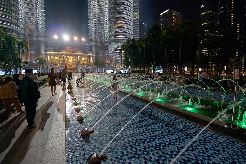 페트로나스 트윈 타워 앞 분수 터널 끝 부분에서 찍으면 대칭한 타워를 찍을 수 있다. 많은 사람들이 그곳에서 타워를 배경으로 자신들의 사진을 남긴다. 하지만 나는 길건너와 같이 거리를 두고 감상하는게 더 멋지다고 생각한다. 당연하지만 낮보다 밤이 더 좋다.