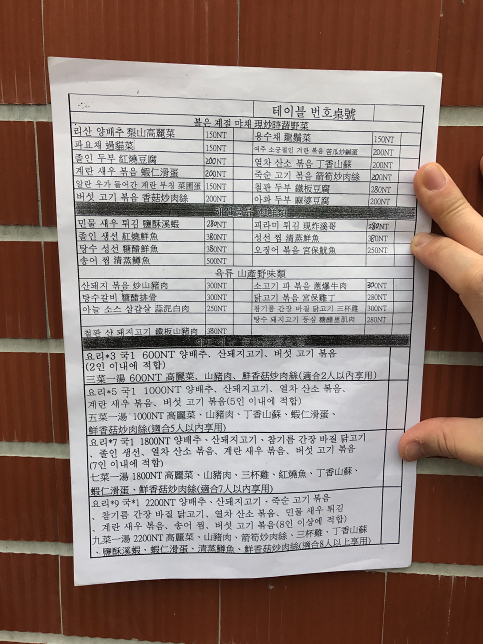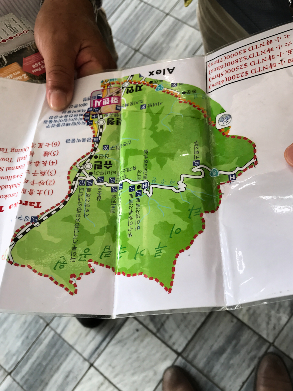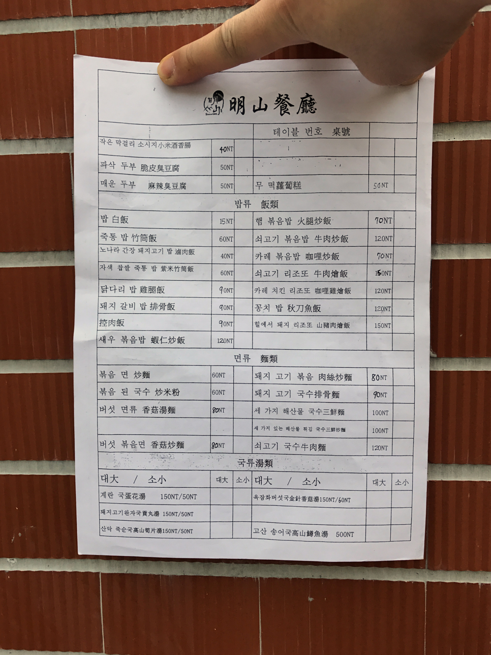 상점과 식당이 여러개 있는 곳이다. 넓은 뜰도 있고 화장실도 있어서 휴게소 용도의 곳으로 보인다. 기사분께서는 이 곳에서 식사를 하는게 좋을 것이라 하셨다. 아마 타이루거 내에 이런 식당 단지는 없는 것 같다. 방문한 식당에서 한국인이라고 하니 한국어 메뉴판(주문서)를 줬다. 한국인들이 많이 오는 것 같다.