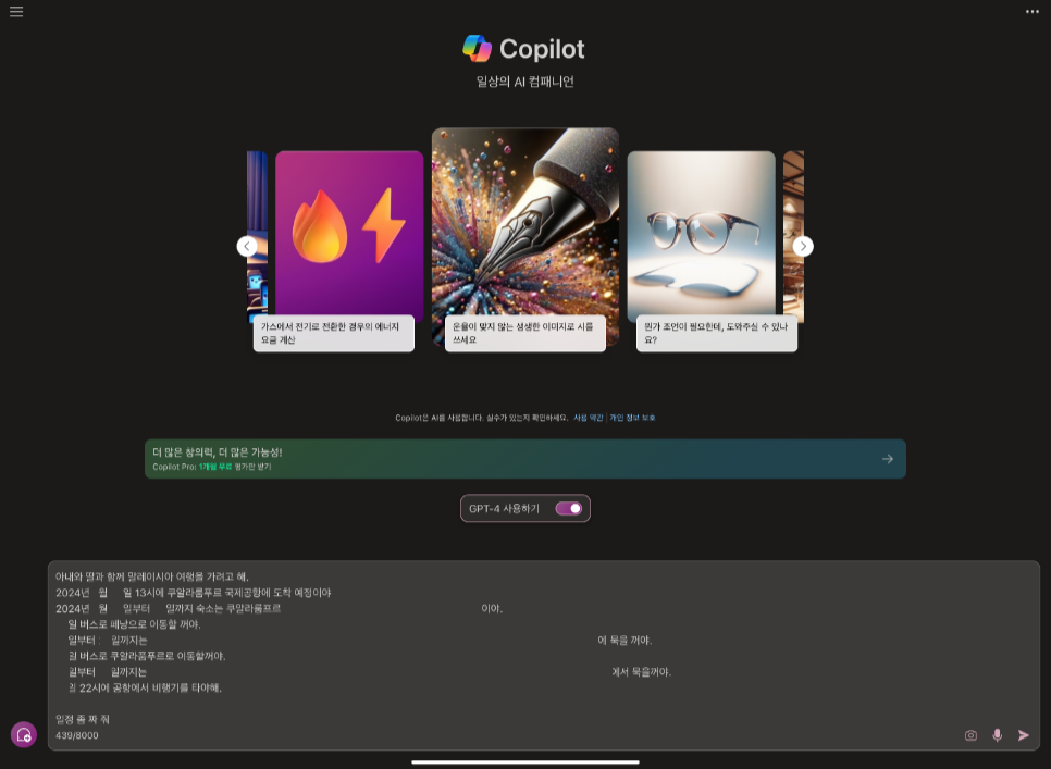 OpenAI의 ChatGPT 무료버전(ver3.5)보다는 MS의 Copilot(GPT-4)무료 버전이 더 괜찮을 것 같다는 생각이 들어서 후자를 선택해서 일정을 정리했다. 이 포스트에 있는 이미지 역시 Copilot을 통해서 그린 이미지를 사용해서 정리해보려 한다. 우선 전체 일정 정리 위주로 질문하고 정리해봤다. 아래 나오는 질문과 답변에 일자와 숙소명은 일부러 바꾸거나 ‘*’로 대치했다.