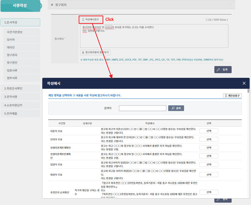 그런데, 입력 상자 위에 보면 '작성예시참조'라는 버튼이 있다. 이 버튼을 클릭하면 사건명에 따른 작성예시를 선택할 수 있는 창이 뜬다.
