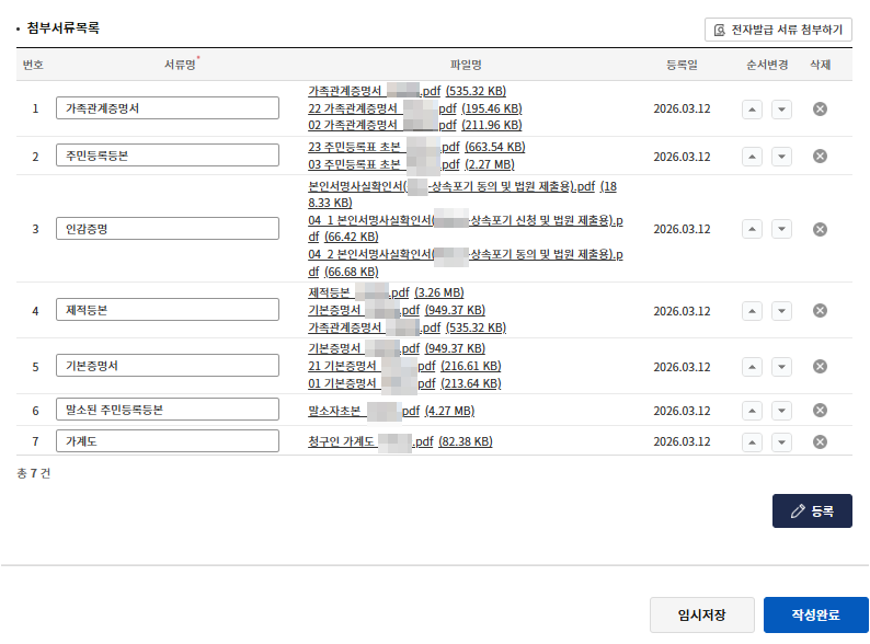 - 가계도: 상속 관계가 한눈에 안 들어오는 경우(예: 손자녀가 신청하는 경우 등) 간단하게 그린 그림 파일을 첨부하면 처리가 빨라짐
