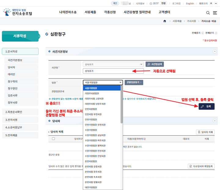 작성화면의 가장 위에는 '사건기본정보' 부분이 있다. 이 심판청구의 사건명과 관할법원을 선택하는 부분이다. 심판청구의 시건명은 자동으로 입력돼 있어서 변경할 필요는 없다.