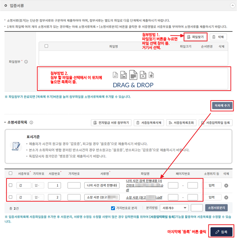 - 첨부파일 (첨부서류): 신청 절차를 위해 부수적으로 필요한 서류. 송달료/인지대 납부 영수증, 위임장(대리인인 경우), 미성년 자녀를 위한 부모의 동의서 등이 포함