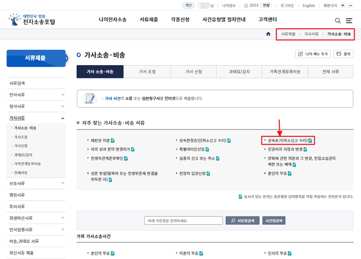 ※ 민사 또는 형사 서류가 아니고, '가사서류'를 선택해야 한다. 상속포기는 가사비송사건으로 처리한다고 함.