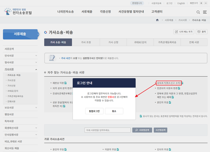 서류제출 메뉴에 마우스 포인터(이하 포인터)를 올리면 하위 메뉴가 아래로 펼쳐진다. 하위 메뉴 중 '가사서류' 그 아래의 ' 가사소송ㆍ비송'을 클릭하자.