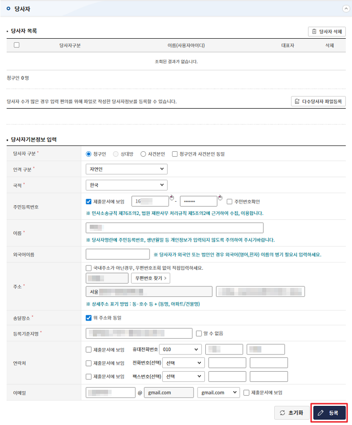 모두 입력했으면 등록 버튼을 클릭하자. 등록이 되면서 윗 부분에 '당사자 목록'에 등록한 자가 목록에 나오는 것을 볼 수 있다. 청구인을 입력했으니 동일한 방법으로 사건본인 정보도 입력하여 등록 하자. 아래와 같이 목록에 등록한 청구인과 사건본인이 나온다.