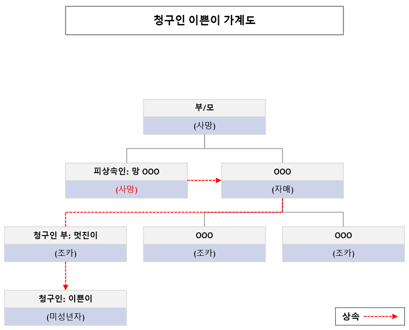 - 상속 관계: 청구인(자녀)이 피상속인의 몇 순위 상속인인지 명시 (예: 손자녀 등)