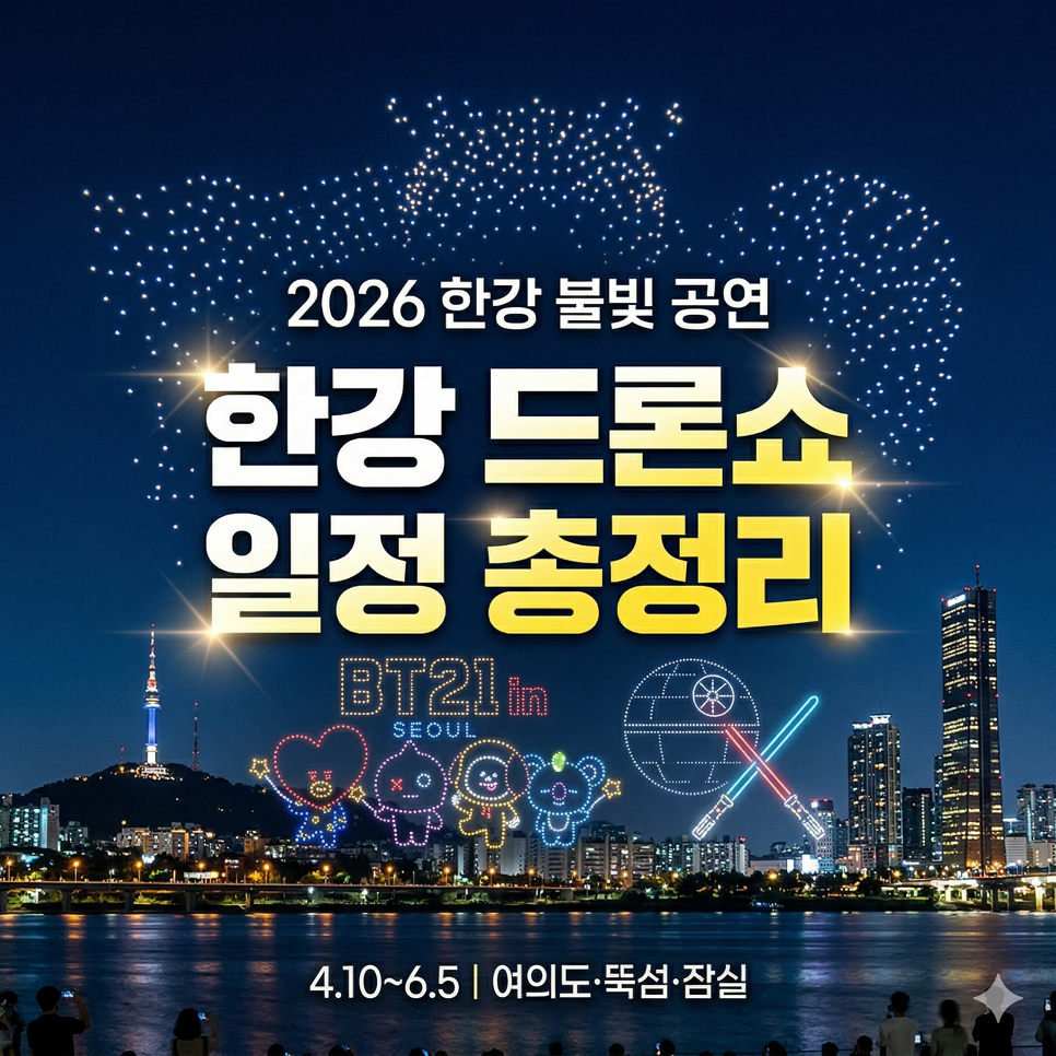 2026년 한강의 밤을 수놓을 '2026 한강 불빛 공연(드론 라이트 쇼)'의 상반기 전체 일정과 시간, 명당 정보를 확인하세요. BT21, 스타워즈 테마 및 어린이날 2,000대 특별 공연 등 4월부터 6월까지 여의도·뚝섬·잠실에서 열리는 축제 핵심 정보를 2026년 최신 기준으로 정리해 드립니다.