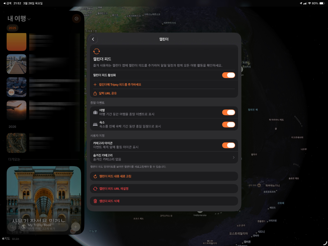 캘린더 연동은 특히 Apple 생태계 안에서 쓰는 사람한테 진짜 유용해. 아이폰·맥·애플워치 다 쓰면 여행 일정이 모든 기기에 자동으로 동기화되니까 별도로 앱 열 필요가 없어.