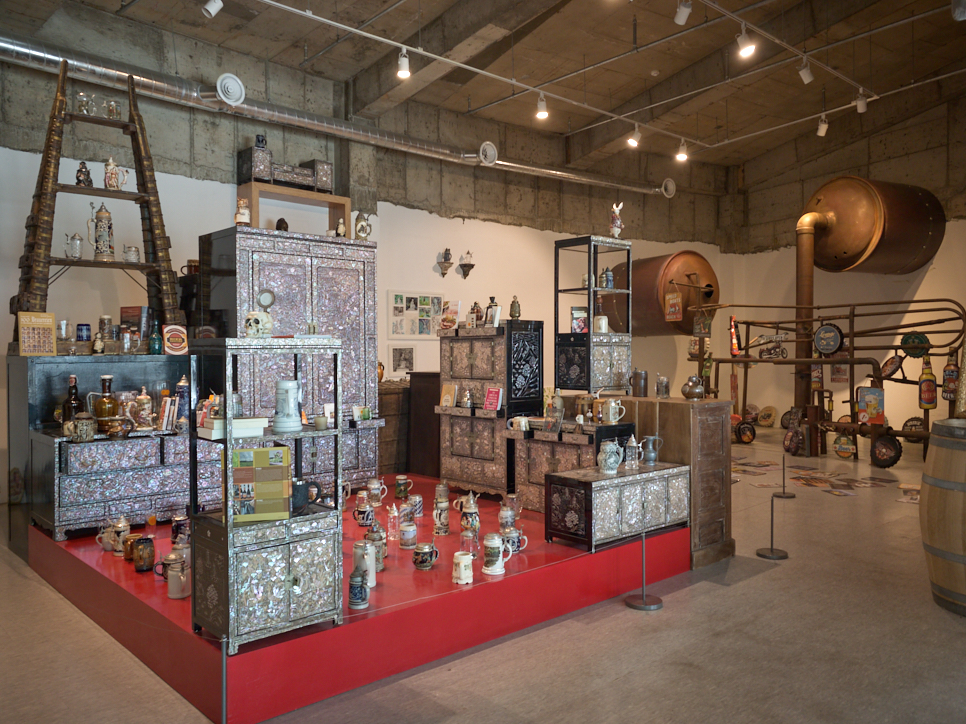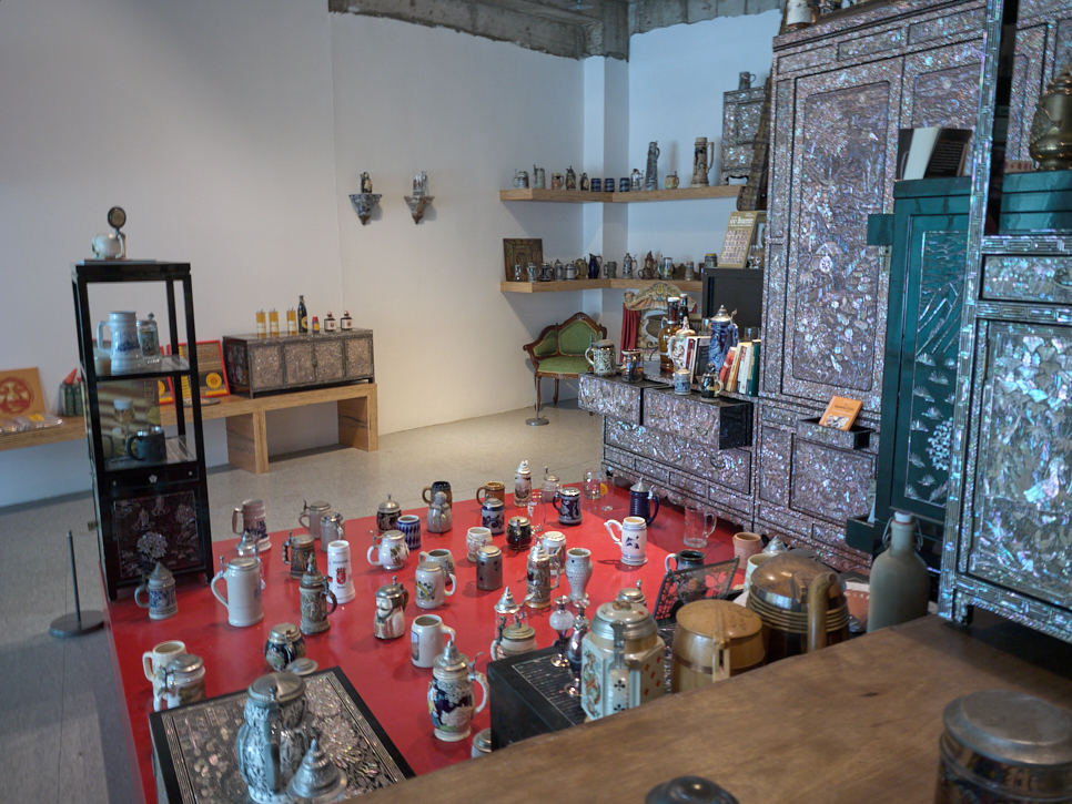 우리 전통의 자재장이 설치된 곳이 보인다. 뒤로는 동으로 만든 것 같은 탱크와 파이프가 보인다. 오래전 강남역 근처 맥주를 만들어서 파는 곳에서 본 시설 같다는 생각이 들어 다가가 보니 맞았다. 자재장이 놓인 곳에는 세계 여러 나라의 맥주잔이 펼쳐져 있다. 자개장과 맥주잔..... 맥주와 관련한 소품(실제로는 크다)들이 펼쳐져 있다. 이곳에서 건너편 창밖을 보며 맥주를 마실 수 있게 해도 괜찮을 것 같았다.
